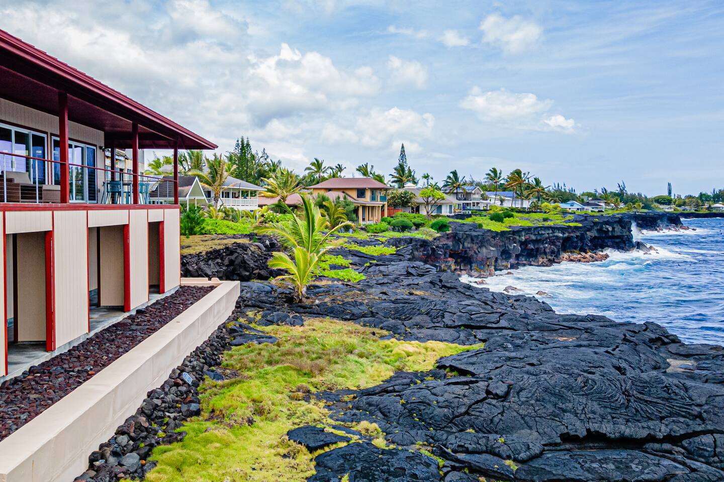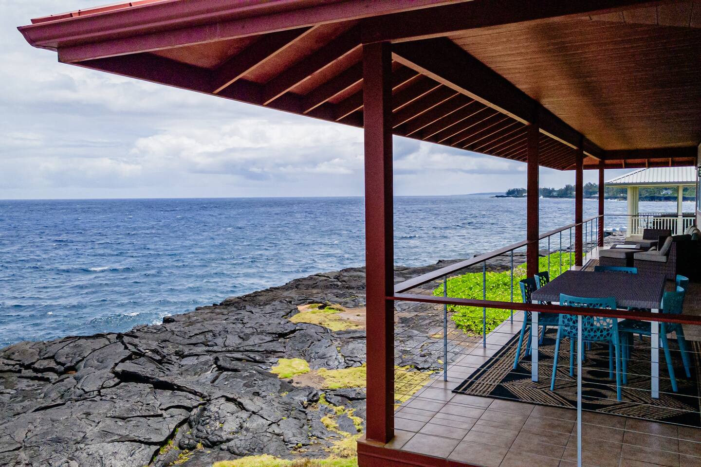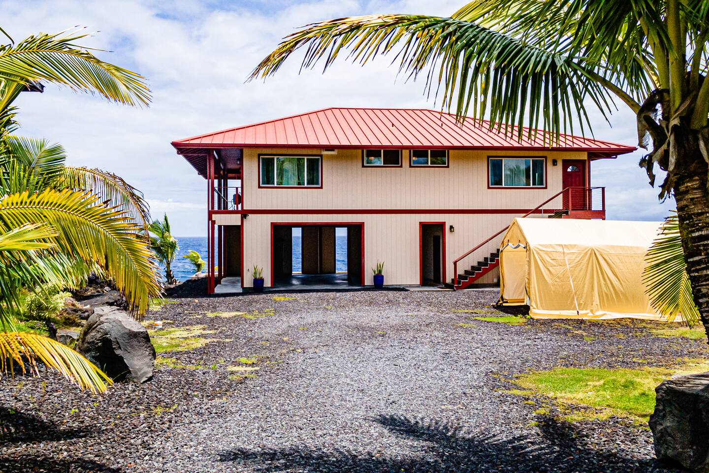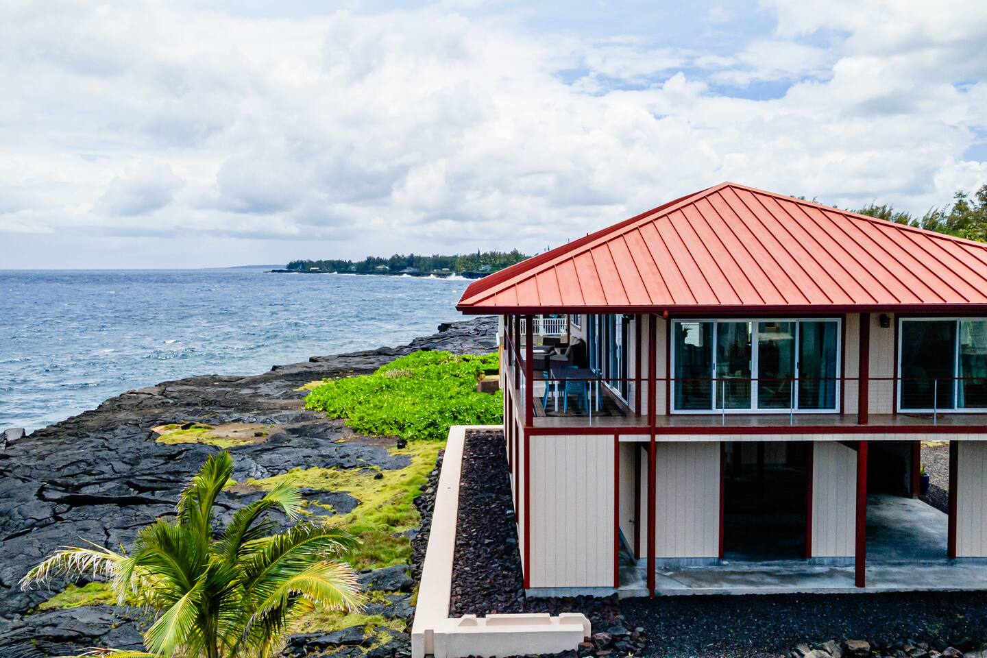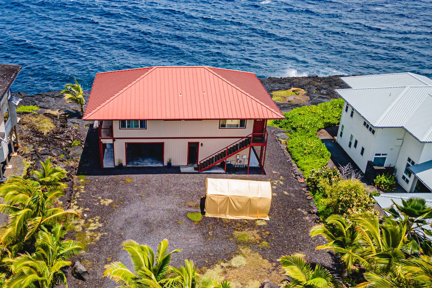 Located on Hawai'i's Big Island (the island of Hawai'i) 25 minutes south of Hilo International Airport. Paradise Ocean Vista is a stunning absolute oceanfront home that feels more like you are on a yacht than at a house. Watch and hear the waves below. Wake up to ocean views from every room! We proudly offer high-quality, comfy Leesa Queen mattresses for your comfortable nights sleep! Beautiful furnishings, designed by NestEgg Designs. The chef-inspired kitchen with new stainless steel appliances is stocked with all the cooking utensils, pots, pans and dishes needed to cook delicious seaside meals. Serve your culinary delights with a side of paradise in a dining area with panoramic ocean views and a sliding door that opens up to the lanai. For a complete oceanfront dining experience, pull up a chair on the lanai dining table or gather around the outdoor seating area. Allow the Hawaiian sea breeze to accompany your views of the beautiful lava rock cliffs and black sands of your paradise retreat. There are two comfortable and stylish bedrooms from which to choose. The first bedroom features ocean views, a queen bed, floor to celling blackout curtains, streaming TV, A/C, ceiling fan, dimmable lighting and a sliding screen door that leads out to the oceanfront lanai. The second bedroom features ocean views, a queen bed, streaming TV, ceiling fan and dimmable lighting. The living room also features a Queen sized pullout couch. Freshening up is a joy in the two well-appointed en suite bathrooms featuring a shower with handheld sprayer, soft towels, hairdryer, toiletries (shampoo, conditioner, body wash) and other thoughtful travel amenities like sunscreen and bug repellant for your waterfall hikes. Paradise Ocean Vista Amenities include: Free WiFi. Fastest WiFi available on the island (fiber), WiFi mesh system covers the entire property in case you want to work outside on the beautiful lanai, Outdoor lounge area, Air conditioner and dehumidifier, free Parking, Full-sized stainless steel refrigerator, Bosch stove w/ convection oven, cooking utensils, pots, pans, dishes, 55-inch HiDef Smart TV, Comfortable mattresses (Leesa) Washer and Dryer, dishwasher, Contactless check-in, boogie/body surfing boards, beach towels and a cooler for your beach excursions. Your host Chase holds an active Hawaii real estate license RS-88207 with Hilo Bay Realty, LLC