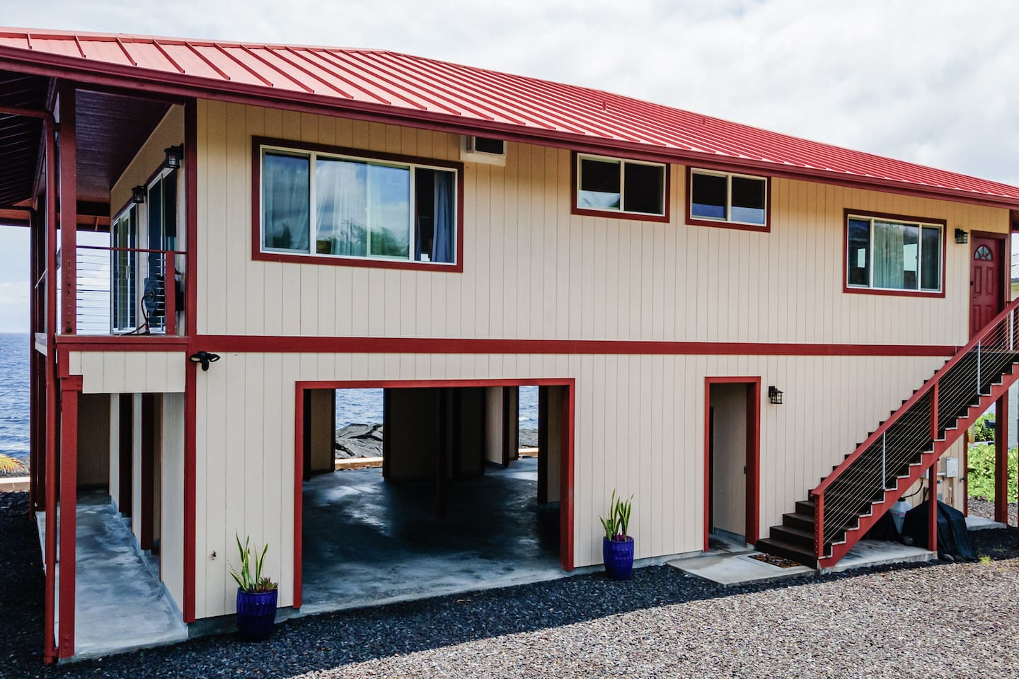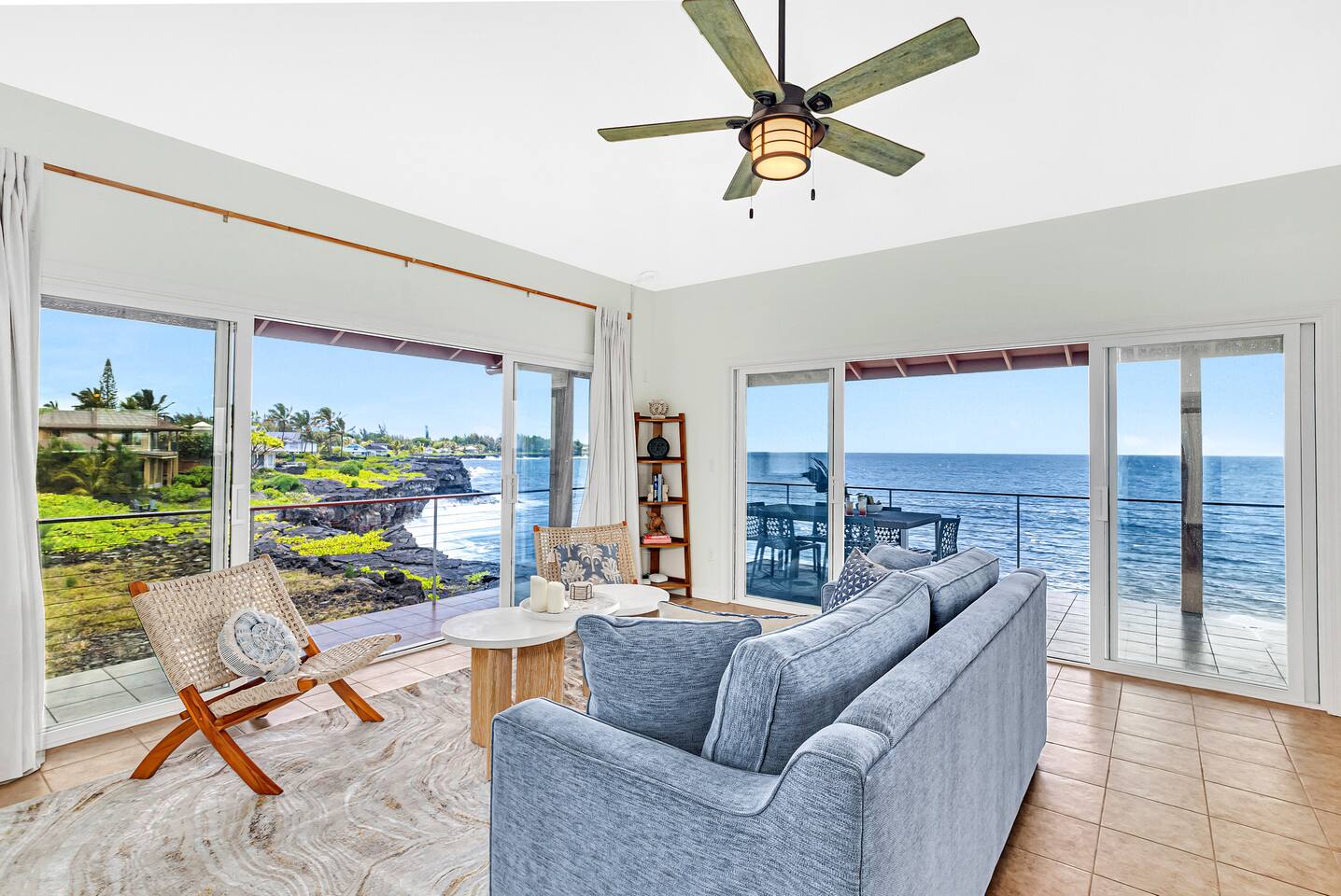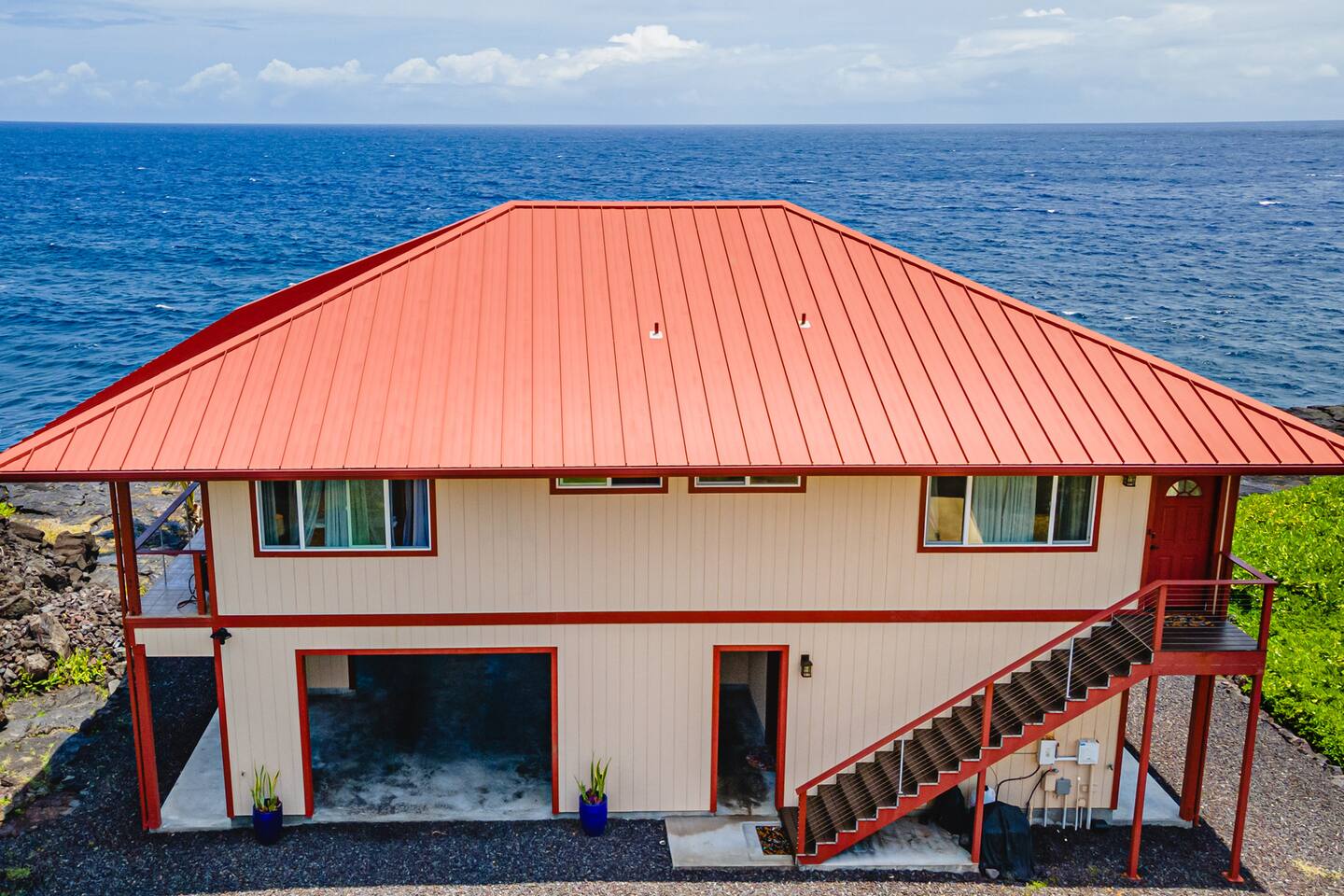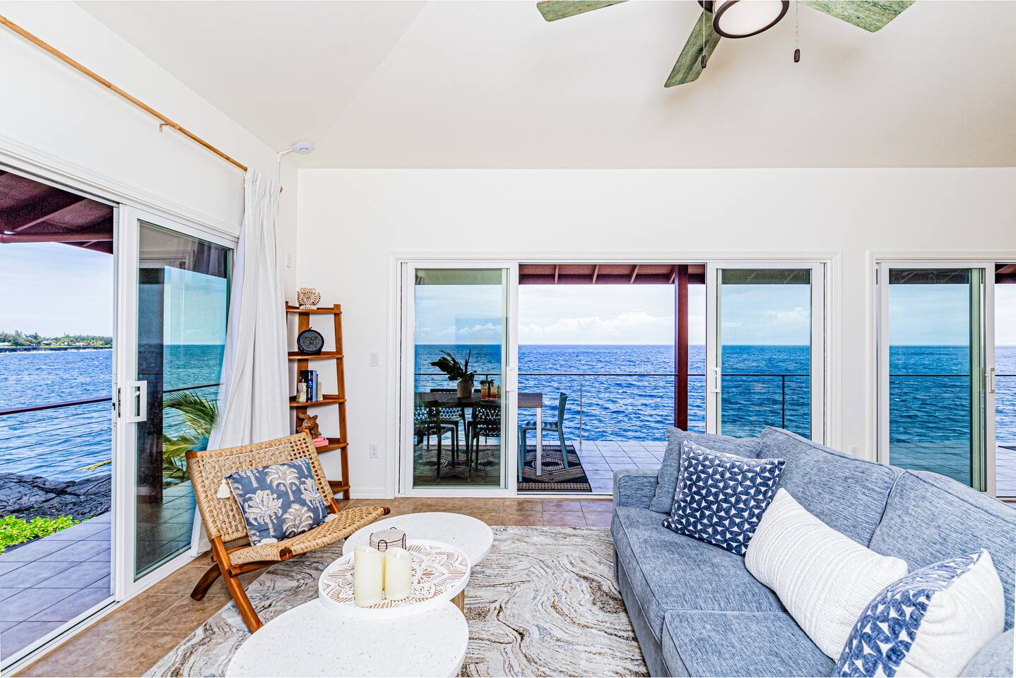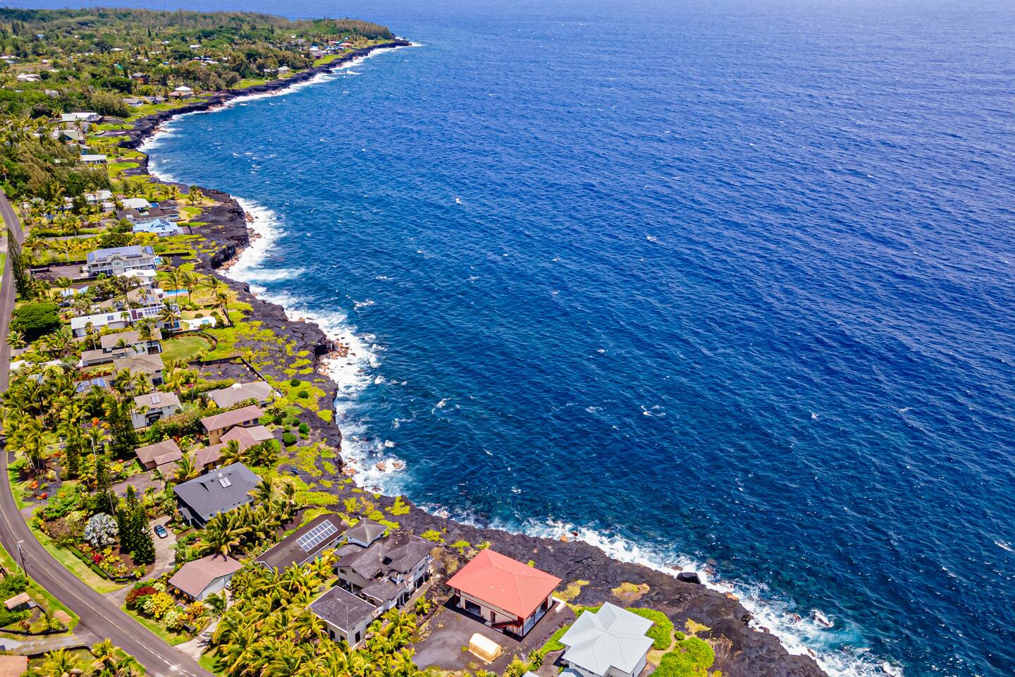 Located on Hawai'i's Big Island (the island of Hawai'i) 25 minutes south of Hilo International Airport. Paradise Ocean Vista is a stunning absolute oceanfront home that feels more like you are on a yacht than at a house. Watch and hear the waves below. Wake up to ocean views from every room! We proudly offer high-quality, comfy Leesa Queen mattresses for your comfortable nights sleep! Beautiful furnishings, designed by NestEgg Designs. The chef-inspired kitchen with new stainless steel appliances is stocked with all the cooking utensils, pots, pans and dishes needed to cook delicious seaside meals. Serve your culinary delights with a side of paradise in a dining area with panoramic ocean views and a sliding door that opens up to the lanai. For a complete oceanfront dining experience, pull up a chair on the lanai dining table or gather around the outdoor seating area. Allow the Hawaiian sea breeze to accompany your views of the beautiful lava rock cliffs and black sands of your paradise retreat. There are two comfortable and stylish bedrooms from which to choose. The first bedroom features ocean views, a queen bed, floor to celling blackout curtains, streaming TV, A/C, ceiling fan, dimmable lighting and a sliding screen door that leads out to the oceanfront lanai. The second bedroom features ocean views, a queen bed, streaming TV, ceiling fan and dimmable lighting. The living room also features a Queen sized pullout couch. Freshening up is a joy in the two well-appointed en suite bathrooms featuring a shower with handheld sprayer, soft towels, hairdryer, toiletries (shampoo, conditioner, body wash) and other thoughtful travel amenities like sunscreen and bug repellant for your waterfall hikes. Paradise Ocean Vista Amenities include: Free WiFi. Fastest WiFi available on the island (fiber), WiFi mesh system covers the entire property in case you want to work outside on the beautiful lanai, Outdoor lounge area, Air conditioner and dehumidifier, free Parking, Full-sized stainless steel refrigerator, Bosch stove w/ convection oven, cooking utensils, pots, pans, dishes, 55-inch HiDef Smart TV, Comfortable mattresses (Leesa) Washer and Dryer, dishwasher, Contactless check-in, boogie/body surfing boards, beach towels and a cooler for your beach excursions. Your host Chase holds an active Hawaii real estate license RS-88207 with Hilo Bay Realty, LLC