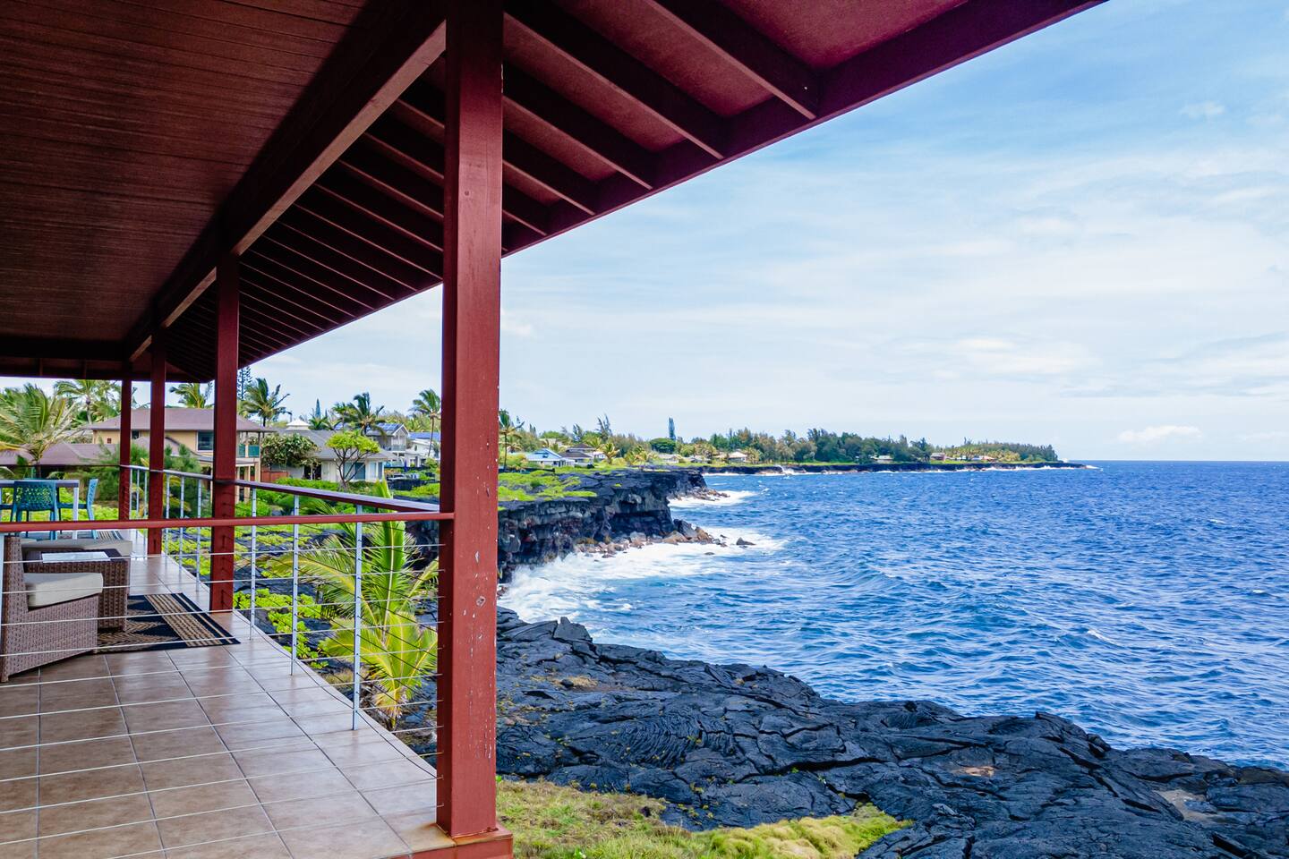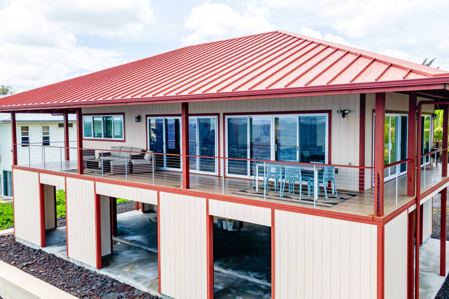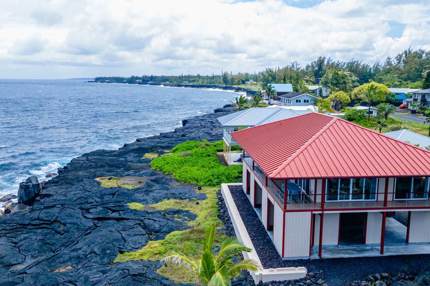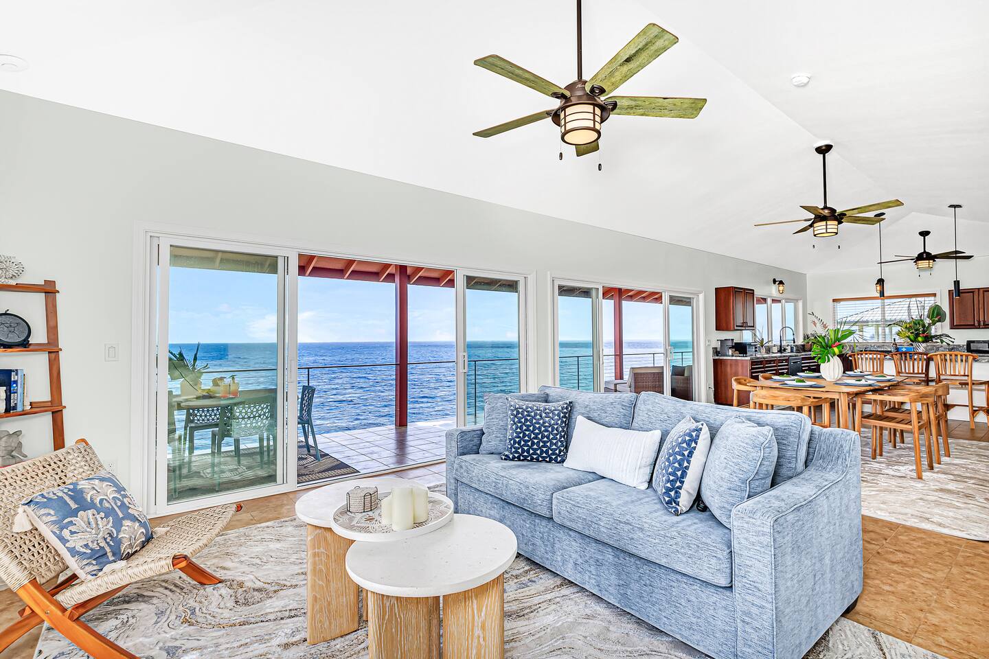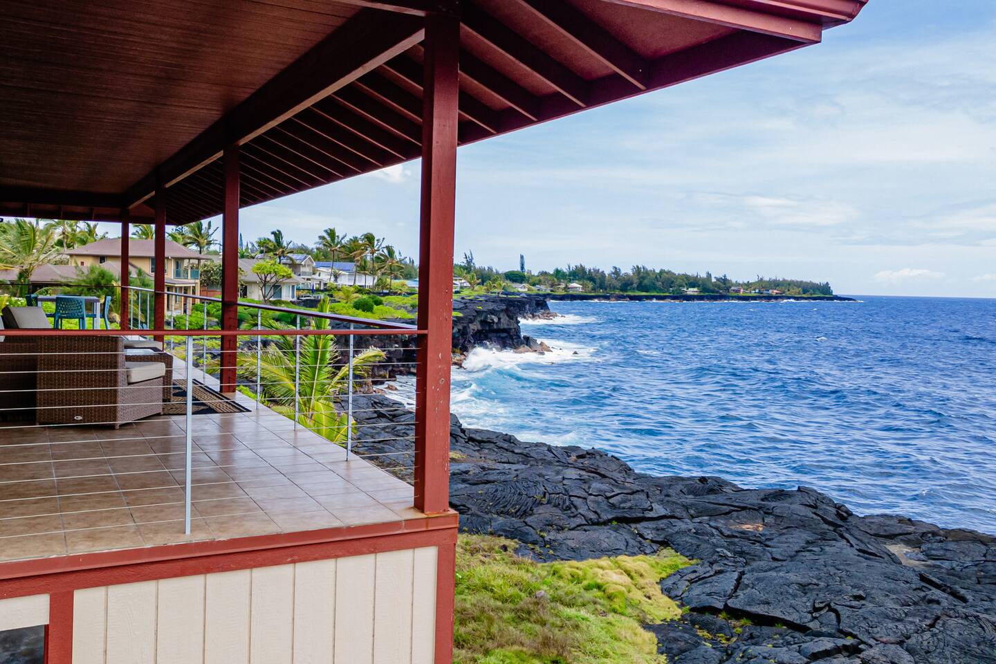 Located on Hawai'i's Big Island (the island of Hawai'i) 25 minutes south of Hilo International Airport. Paradise Ocean Vista is a stunning absolute oceanfront home that feels more like you are on a yacht than at a house. Watch and hear the waves below. Wake up to ocean views from every room! We proudly offer high-quality, comfy Leesa Queen mattresses for your comfortable nights sleep! Beautiful furnishings, designed by NestEgg Designs. The chef-inspired kitchen with new stainless steel appliances is stocked with all the cooking utensils, pots, pans and dishes needed to cook delicious seaside meals. Serve your culinary delights with a side of paradise in a dining area with panoramic ocean views and a sliding door that opens up to the lanai. For a complete oceanfront dining experience, pull up a chair on the lanai dining table or gather around the outdoor seating area. Allow the Hawaiian sea breeze to accompany your views of the beautiful lava rock cliffs and black sands of your paradise retreat. There are two comfortable and stylish bedrooms from which to choose. The first bedroom features ocean views, a queen bed, floor to celling blackout curtains, streaming TV, A/C, ceiling fan, dimmable lighting and a sliding screen door that leads out to the oceanfront lanai. The second bedroom features ocean views, a queen bed, streaming TV, ceiling fan and dimmable lighting. The living room also features a Queen sized pullout couch. Freshening up is a joy in the two well-appointed en suite bathrooms featuring a shower with handheld sprayer, soft towels, hairdryer, toiletries (shampoo, conditioner, body wash) and other thoughtful travel amenities like sunscreen and bug repellant for your waterfall hikes. Paradise Ocean Vista Amenities include: Free WiFi. Fastest WiFi available on the island (fiber), WiFi mesh system covers the entire property in case you want to work outside on the beautiful lanai, Outdoor lounge area, Air conditioner and dehumidifier, free Parking, Full-sized stainless steel refrigerator, Bosch stove w/ convection oven, cooking utensils, pots, pans, dishes, 55-inch HiDef Smart TV, Comfortable mattresses (Leesa) Washer and Dryer, dishwasher, Contactless check-in, boogie/body surfing boards, beach towels and a cooler for your beach excursions. Your host Chase holds an active Hawaii real estate license RS-88207 with Hilo Bay Realty, LLC