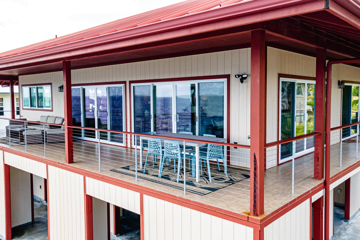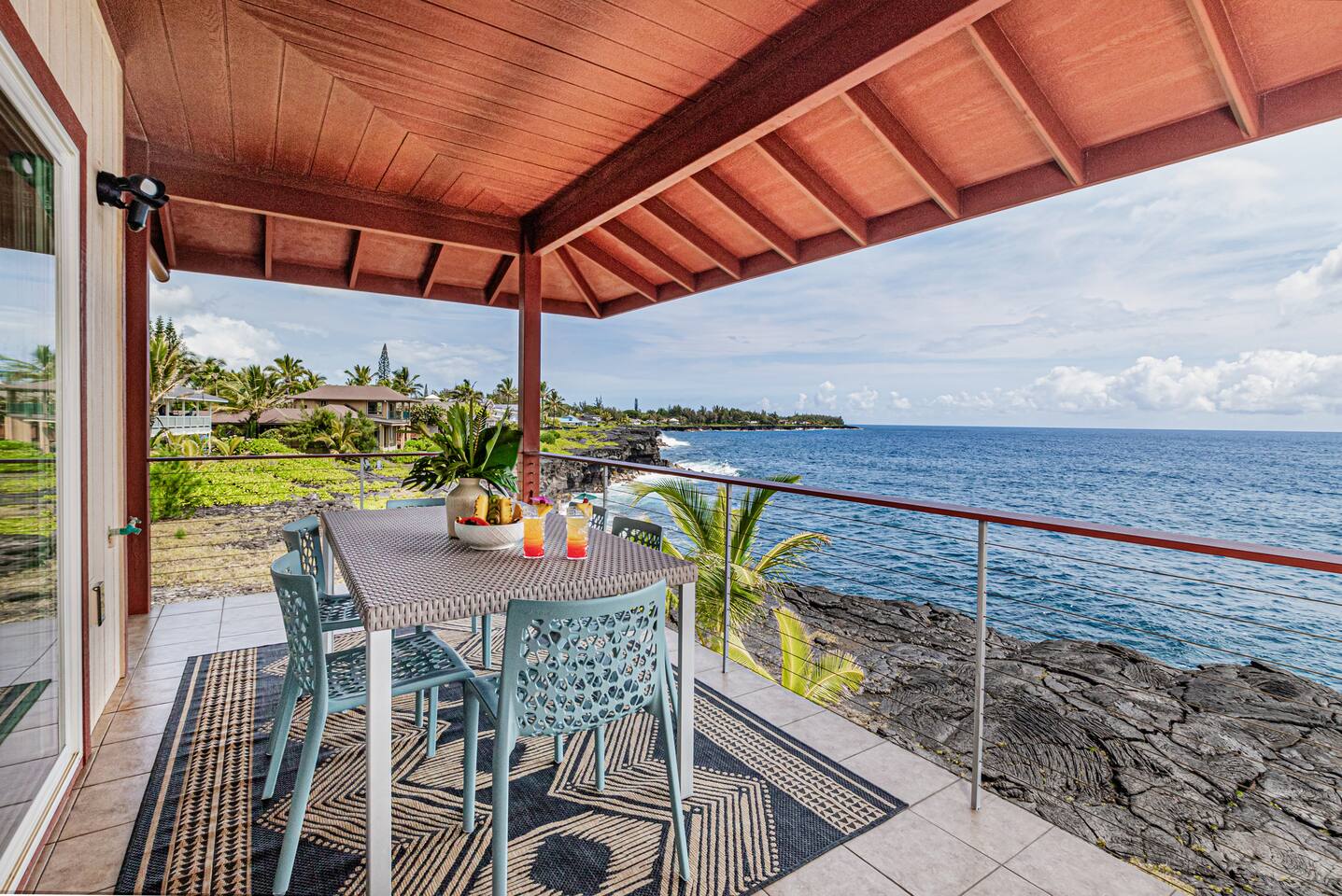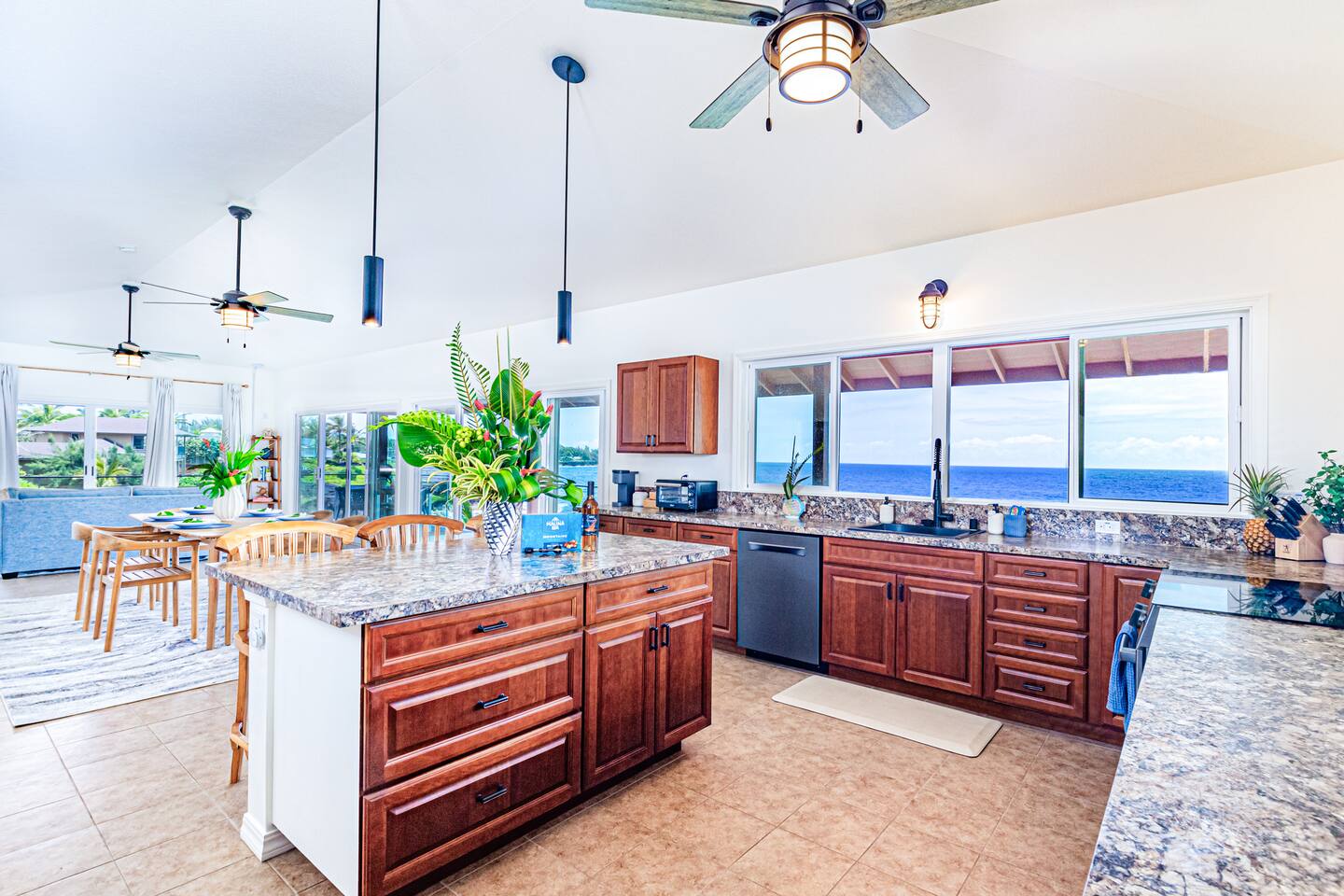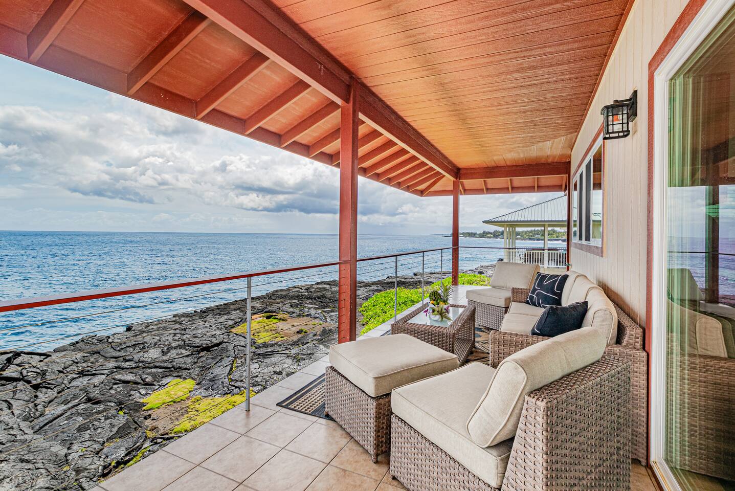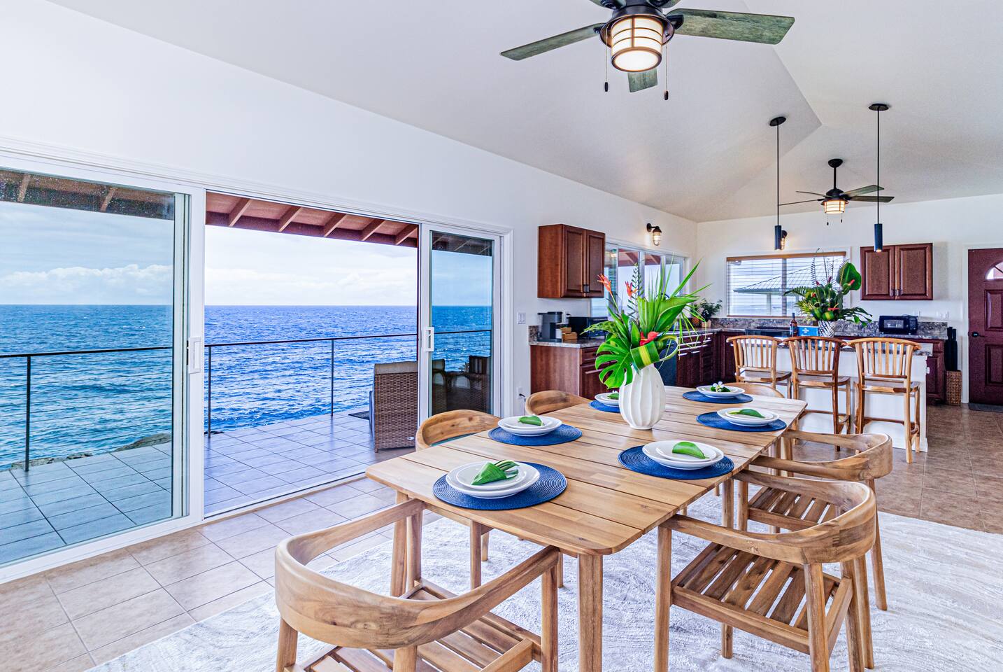 Located on Hawai'i's Big Island (the island of Hawai'i) 25 minutes south of Hilo International Airport. Paradise Ocean Vista is a stunning absolute oceanfront home that feels more like you are on a yacht than at a house. Watch and hear the waves below. Wake up to ocean views from every room! We proudly offer high-quality, comfy Leesa Queen mattresses for your comfortable nights sleep! Beautiful furnishings, designed by NestEgg Designs. The chef-inspired kitchen with new stainless steel appliances is stocked with all the cooking utensils, pots, pans and dishes needed to cook delicious seaside meals. Serve your culinary delights with a side of paradise in a dining area with panoramic ocean views and a sliding door that opens up to the lanai. For a complete oceanfront dining experience, pull up a chair on the lanai dining table or gather around the outdoor seating area. Allow the Hawaiian sea breeze to accompany your views of the beautiful lava rock cliffs and black sands of your paradise retreat. There are two comfortable and stylish bedrooms from which to choose. The first bedroom features ocean views, a queen bed, floor to celling blackout curtains, streaming TV, A/C, ceiling fan, dimmable lighting and a sliding screen door that leads out to the oceanfront lanai. The second bedroom features ocean views, a queen bed, streaming TV, ceiling fan and dimmable lighting. The living room also features a Queen sized pullout couch. Freshening up is a joy in the two well-appointed en suite bathrooms featuring a shower with handheld sprayer, soft towels, hairdryer, toiletries (shampoo, conditioner, body wash) and other thoughtful travel amenities like sunscreen and bug repellant for your waterfall hikes. Paradise Ocean Vista Amenities include: Free WiFi. Fastest WiFi available on the island (fiber), WiFi mesh system covers the entire property in case you want to work outside on the beautiful lanai, Outdoor lounge area, Air conditioner and dehumidifier, free Parking, Full-sized stainless steel refrigerator, Bosch stove w/ convection oven, cooking utensils, pots, pans, dishes, 55-inch HiDef Smart TV, Comfortable mattresses (Leesa) Washer and Dryer, dishwasher, Contactless check-in, boogie/body surfing boards, beach towels and a cooler for your beach excursions. Your host Chase holds an active Hawaii real estate license RS-88207 with Hilo Bay Realty, LLC