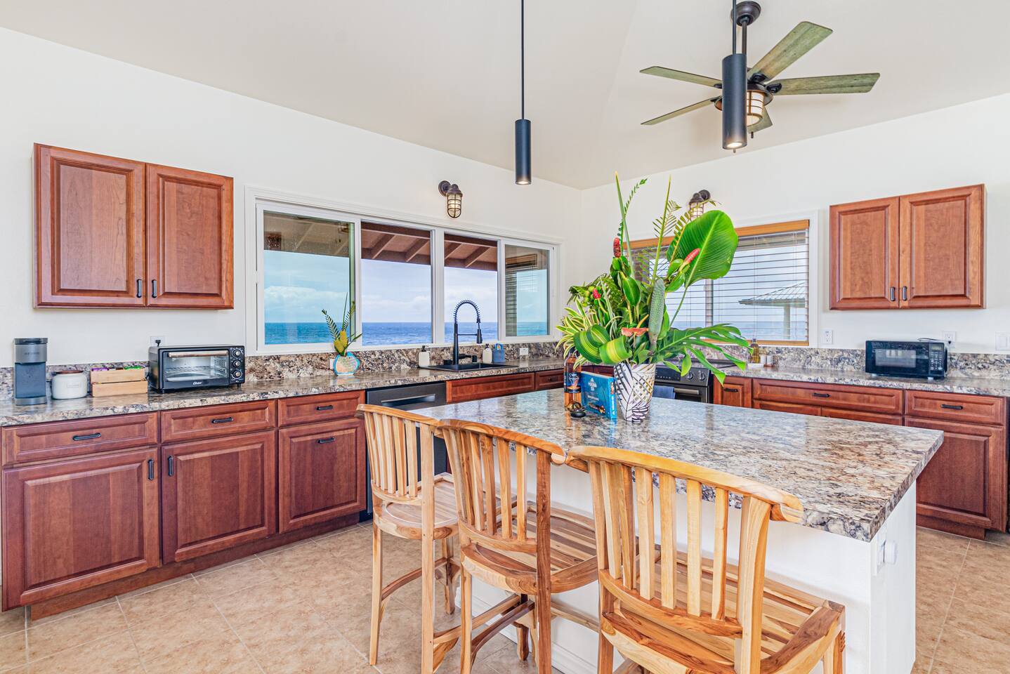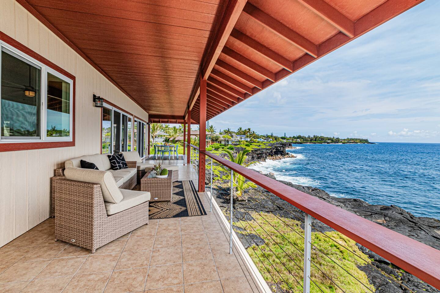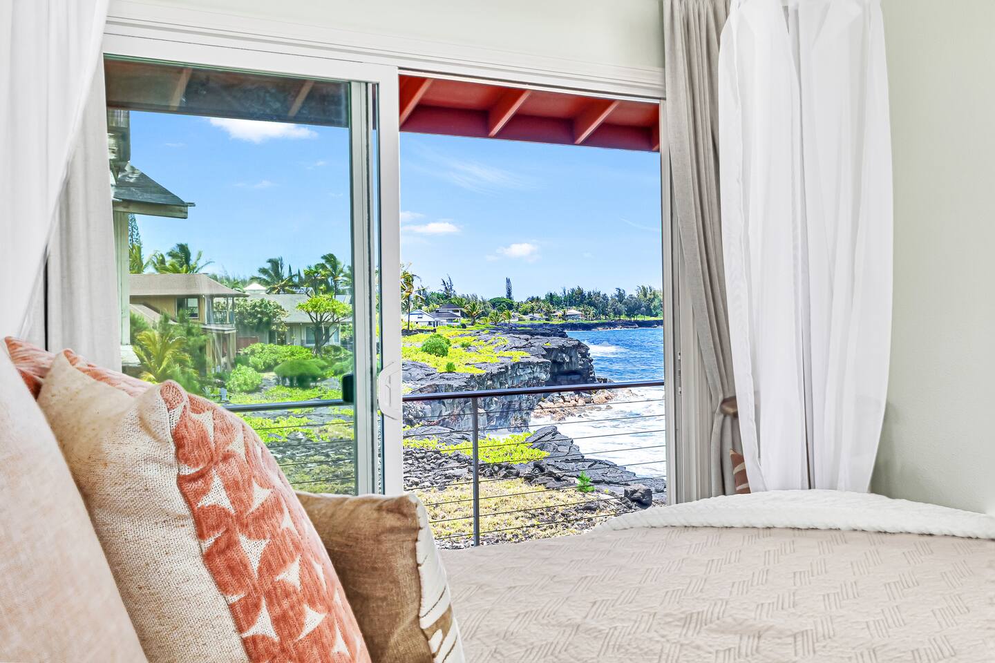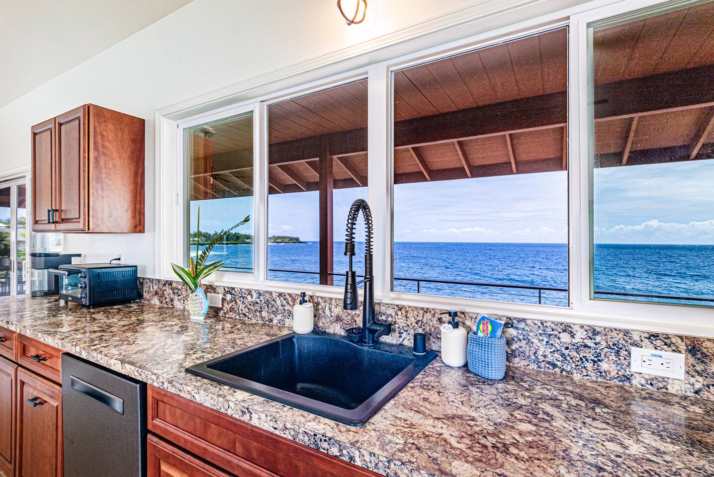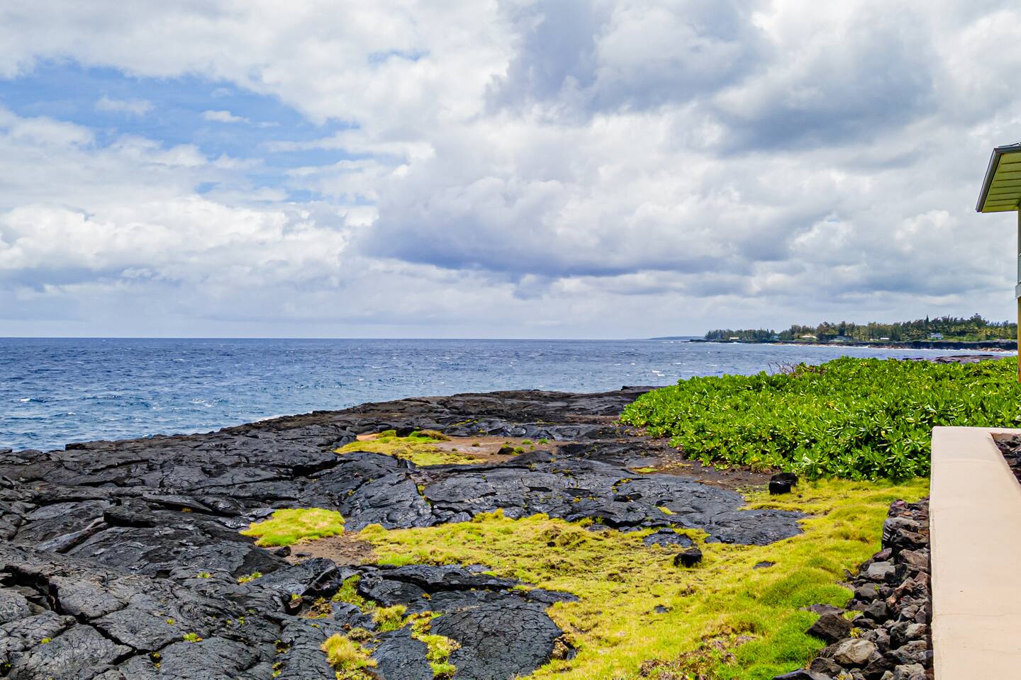 Located on Hawai'i's Big Island (the island of Hawai'i) 25 minutes south of Hilo International Airport. Paradise Ocean Vista is a stunning absolute oceanfront home that feels more like you are on a yacht than at a house. Watch and hear the waves below. Wake up to ocean views from every room! We proudly offer high-quality, comfy Leesa Queen mattresses for your comfortable nights sleep! Beautiful furnishings, designed by NestEgg Designs. The chef-inspired kitchen with new stainless steel appliances is stocked with all the cooking utensils, pots, pans and dishes needed to cook delicious seaside meals. Serve your culinary delights with a side of paradise in a dining area with panoramic ocean views and a sliding door that opens up to the lanai. For a complete oceanfront dining experience, pull up a chair on the lanai dining table or gather around the outdoor seating area. Allow the Hawaiian sea breeze to accompany your views of the beautiful lava rock cliffs and black sands of your paradise retreat. There are two comfortable and stylish bedrooms from which to choose. The first bedroom features ocean views, a queen bed, floor to celling blackout curtains, streaming TV, A/C, ceiling fan, dimmable lighting and a sliding screen door that leads out to the oceanfront lanai. The second bedroom features ocean views, a queen bed, streaming TV, ceiling fan and dimmable lighting. The living room also features a Queen sized pullout couch. Freshening up is a joy in the two well-appointed en suite bathrooms featuring a shower with handheld sprayer, soft towels, hairdryer, toiletries (shampoo, conditioner, body wash) and other thoughtful travel amenities like sunscreen and bug repellant for your waterfall hikes. Paradise Ocean Vista Amenities include: Free WiFi. Fastest WiFi available on the island (fiber), WiFi mesh system covers the entire property in case you want to work outside on the beautiful lanai, Outdoor lounge area, Air conditioner and dehumidifier, free Parking, Full-sized stainless steel refrigerator, Bosch stove w/ convection oven, cooking utensils, pots, pans, dishes, 55-inch HiDef Smart TV, Comfortable mattresses (Leesa) Washer and Dryer, dishwasher, Contactless check-in, boogie/body surfing boards, beach towels and a cooler for your beach excursions. Your host Chase holds an active Hawaii real estate license RS-88207 with Hilo Bay Realty, LLC