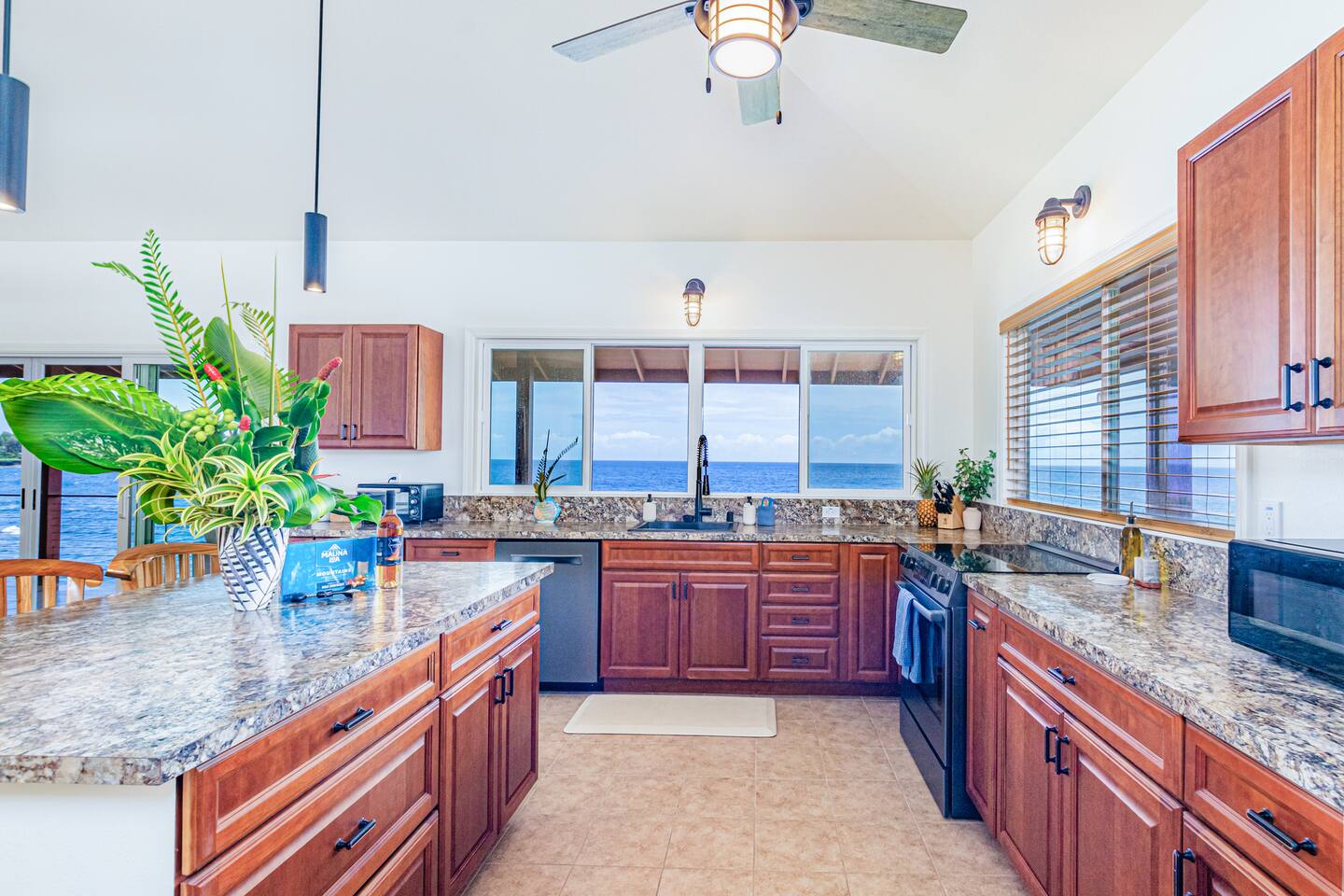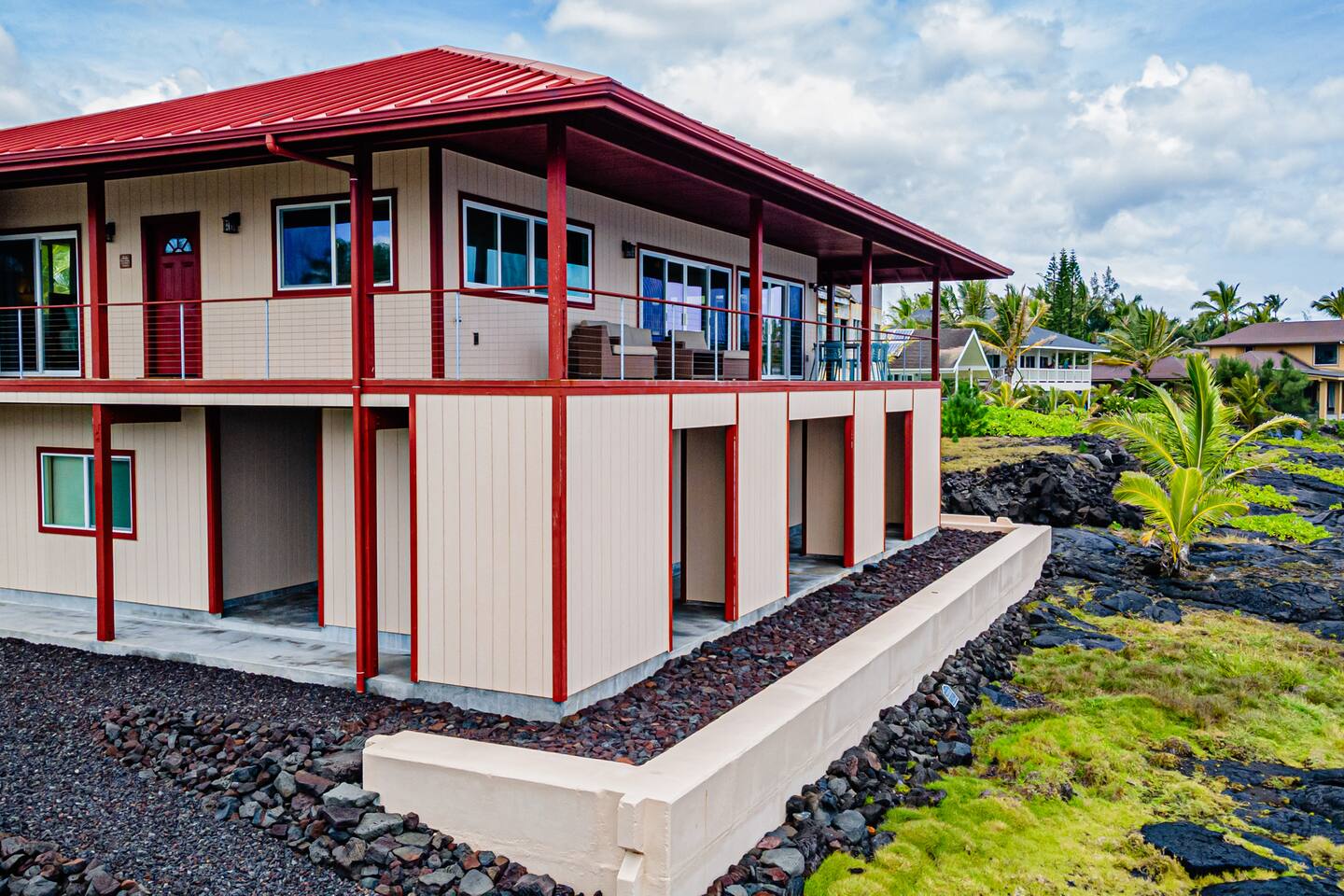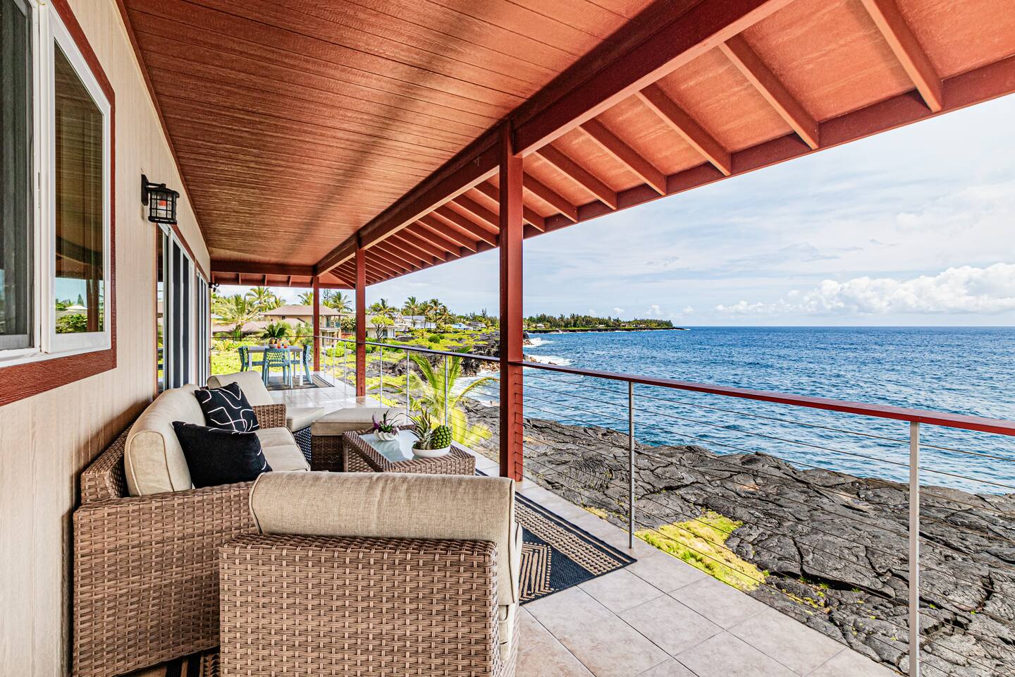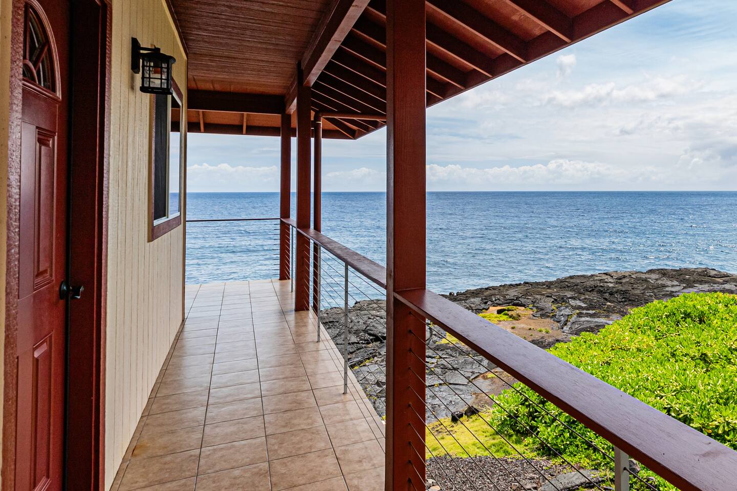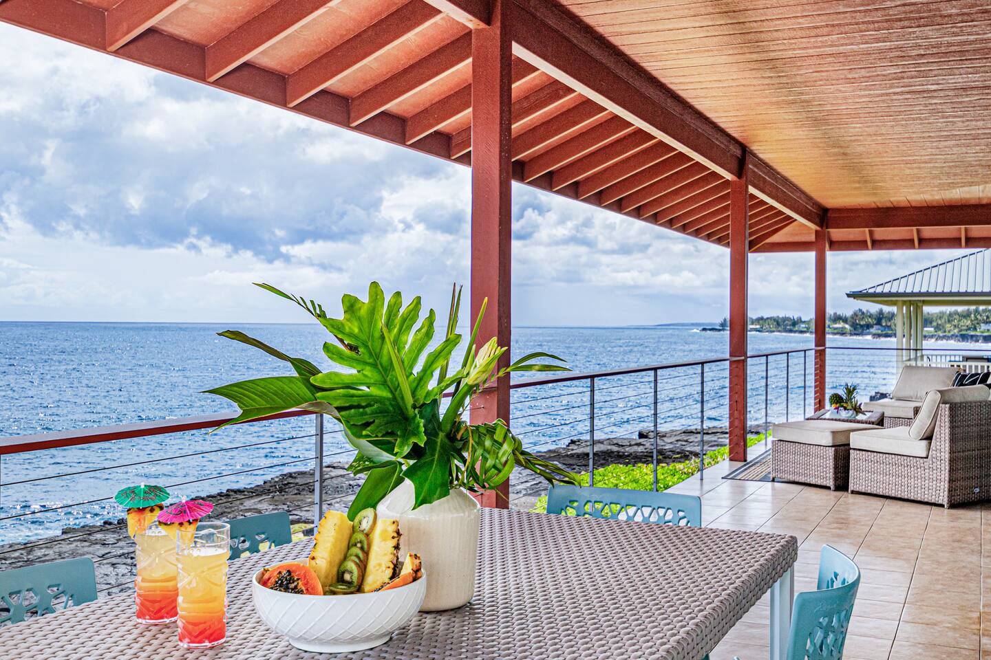 Located on Hawai'i's Big Island (the island of Hawai'i) 25 minutes south of Hilo International Airport. Paradise Ocean Vista is a stunning absolute oceanfront home that feels more like you are on a yacht than at a house. Watch and hear the waves below. Wake up to ocean views from every room! We proudly offer high-quality, comfy Leesa Queen mattresses for your comfortable nights sleep! Beautiful furnishings, designed by NestEgg Designs. The chef-inspired kitchen with new stainless steel appliances is stocked with all the cooking utensils, pots, pans and dishes needed to cook delicious seaside meals. Serve your culinary delights with a side of paradise in a dining area with panoramic ocean views and a sliding door that opens up to the lanai. For a complete oceanfront dining experience, pull up a chair on the lanai dining table or gather around the outdoor seating area. Allow the Hawaiian sea breeze to accompany your views of the beautiful lava rock cliffs and black sands of your paradise retreat. There are two comfortable and stylish bedrooms from which to choose. The first bedroom features ocean views, a queen bed, floor to celling blackout curtains, streaming TV, A/C, ceiling fan, dimmable lighting and a sliding screen door that leads out to the oceanfront lanai. The second bedroom features ocean views, a queen bed, streaming TV, ceiling fan and dimmable lighting. The living room also features a Queen sized pullout couch. Freshening up is a joy in the two well-appointed en suite bathrooms featuring a shower with handheld sprayer, soft towels, hairdryer, toiletries (shampoo, conditioner, body wash) and other thoughtful travel amenities like sunscreen and bug repellant for your waterfall hikes. Paradise Ocean Vista Amenities include: Free WiFi. Fastest WiFi available on the island (fiber), WiFi mesh system covers the entire property in case you want to work outside on the beautiful lanai, Outdoor lounge area, Air conditioner and dehumidifier, free Parking, Full-sized stainless steel refrigerator, Bosch stove w/ convection oven, cooking utensils, pots, pans, dishes, 55-inch HiDef Smart TV, Comfortable mattresses (Leesa) Washer and Dryer, dishwasher, Contactless check-in, boogie/body surfing boards, beach towels and a cooler for your beach excursions. Your host Chase holds an active Hawaii real estate license RS-88207 with Hilo Bay Realty, LLC