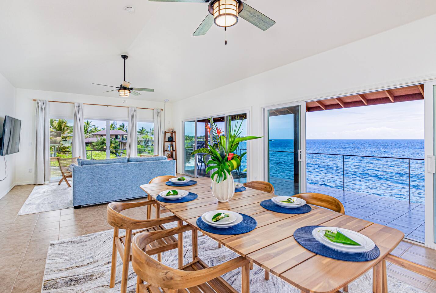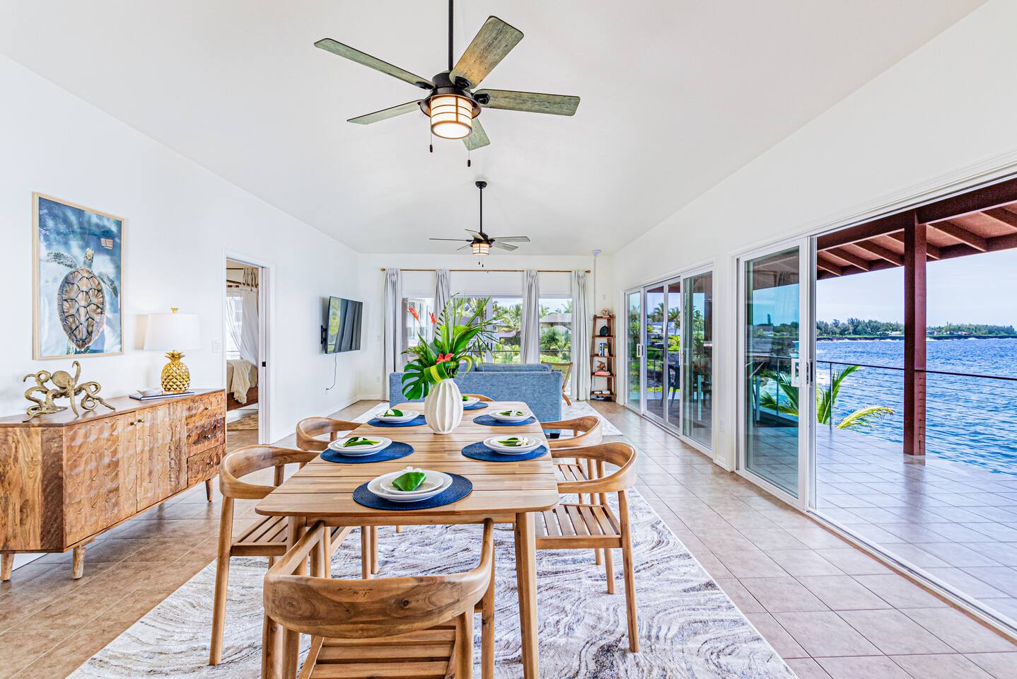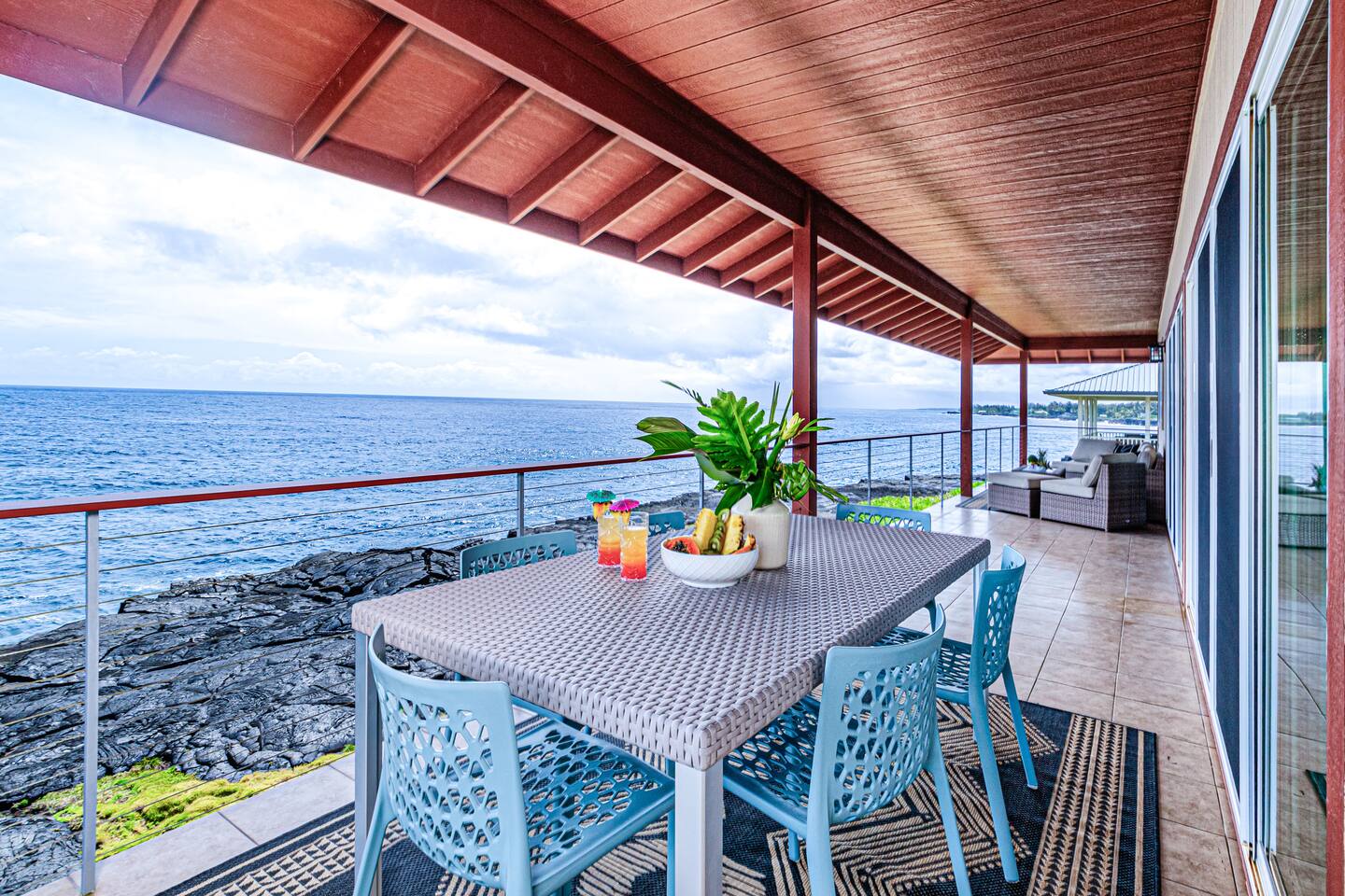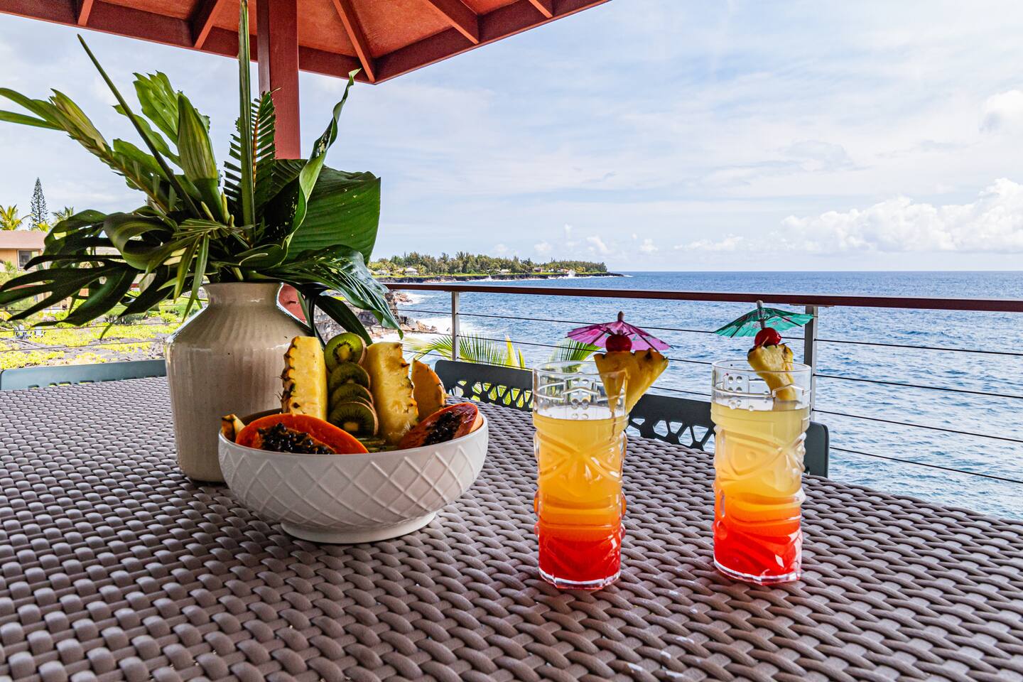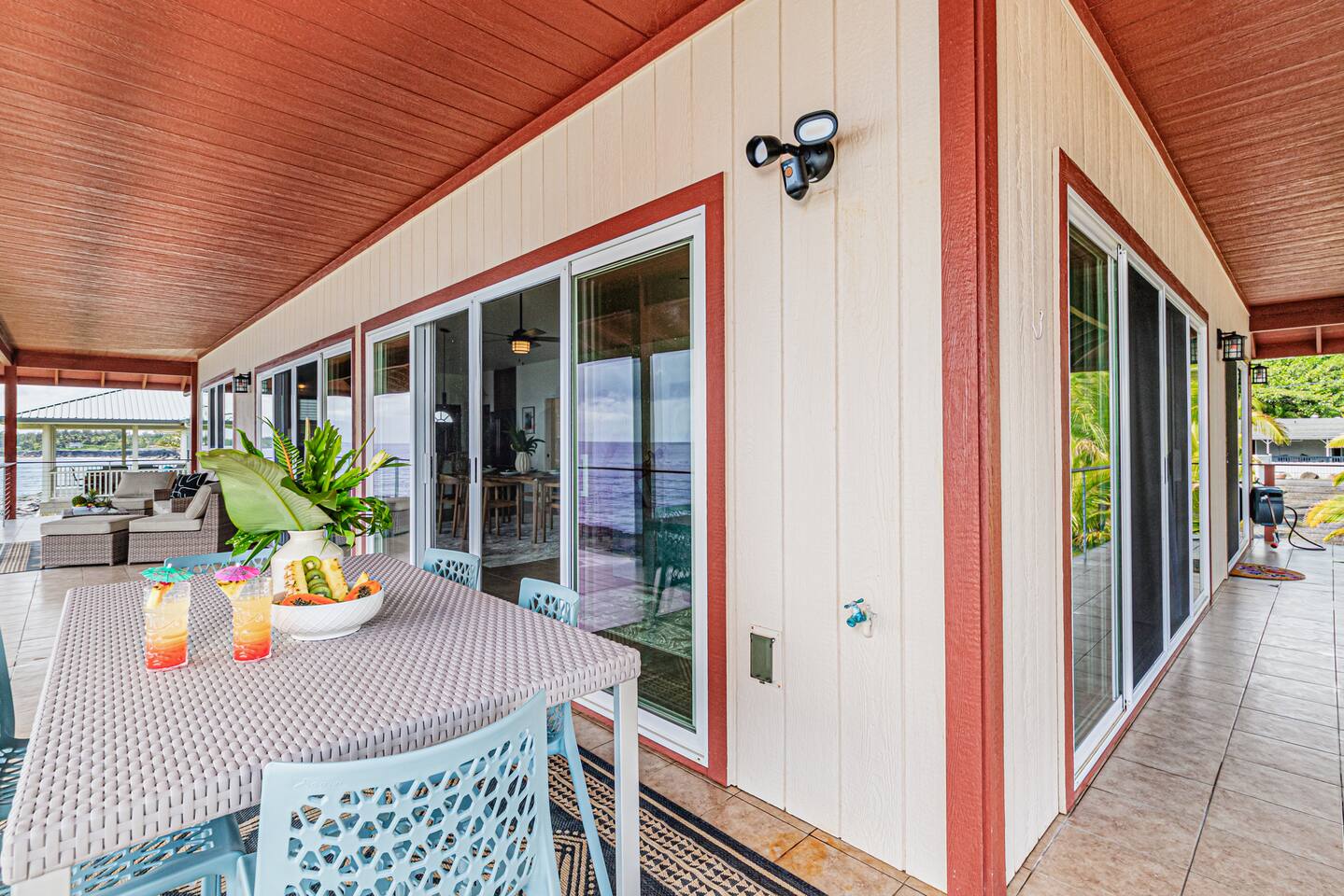 Located on Hawai'i's Big Island (the island of Hawai'i) 25 minutes south of Hilo International Airport. Paradise Ocean Vista is a stunning absolute oceanfront home that feels more like you are on a yacht than at a house. Watch and hear the waves below. Wake up to ocean views from every room! We proudly offer high-quality, comfy Leesa Queen mattresses for your comfortable nights sleep! Beautiful furnishings, designed by NestEgg Designs. The chef-inspired kitchen with new stainless steel appliances is stocked with all the cooking utensils, pots, pans and dishes needed to cook delicious seaside meals. Serve your culinary delights with a side of paradise in a dining area with panoramic ocean views and a sliding door that opens up to the lanai. For a complete oceanfront dining experience, pull up a chair on the lanai dining table or gather around the outdoor seating area. Allow the Hawaiian sea breeze to accompany your views of the beautiful lava rock cliffs and black sands of your paradise retreat. There are two comfortable and stylish bedrooms from which to choose. The first bedroom features ocean views, a queen bed, floor to celling blackout curtains, streaming TV, A/C, ceiling fan, dimmable lighting and a sliding screen door that leads out to the oceanfront lanai. The second bedroom features ocean views, a queen bed, streaming TV, ceiling fan and dimmable lighting. The living room also features a Queen sized pullout couch. Freshening up is a joy in the two well-appointed en suite bathrooms featuring a shower with handheld sprayer, soft towels, hairdryer, toiletries (shampoo, conditioner, body wash) and other thoughtful travel amenities like sunscreen and bug repellant for your waterfall hikes. Paradise Ocean Vista Amenities include: Free WiFi. Fastest WiFi available on the island (fiber), WiFi mesh system covers the entire property in case you want to work outside on the beautiful lanai, Outdoor lounge area, Air conditioner and dehumidifier, free Parking, Full-sized stainless steel refrigerator, Bosch stove w/ convection oven, cooking utensils, pots, pans, dishes, 55-inch HiDef Smart TV, Comfortable mattresses (Leesa) Washer and Dryer, dishwasher, Contactless check-in, boogie/body surfing boards, beach towels and a cooler for your beach excursions. Your host Chase holds an active Hawaii real estate license RS-88207 with Hilo Bay Realty, LLC