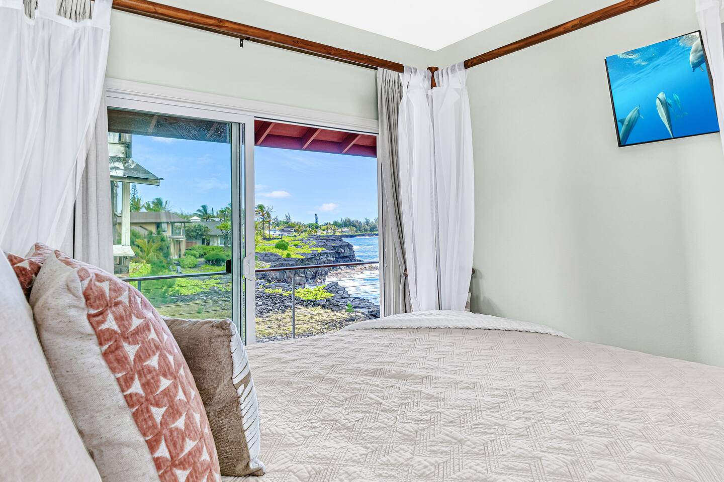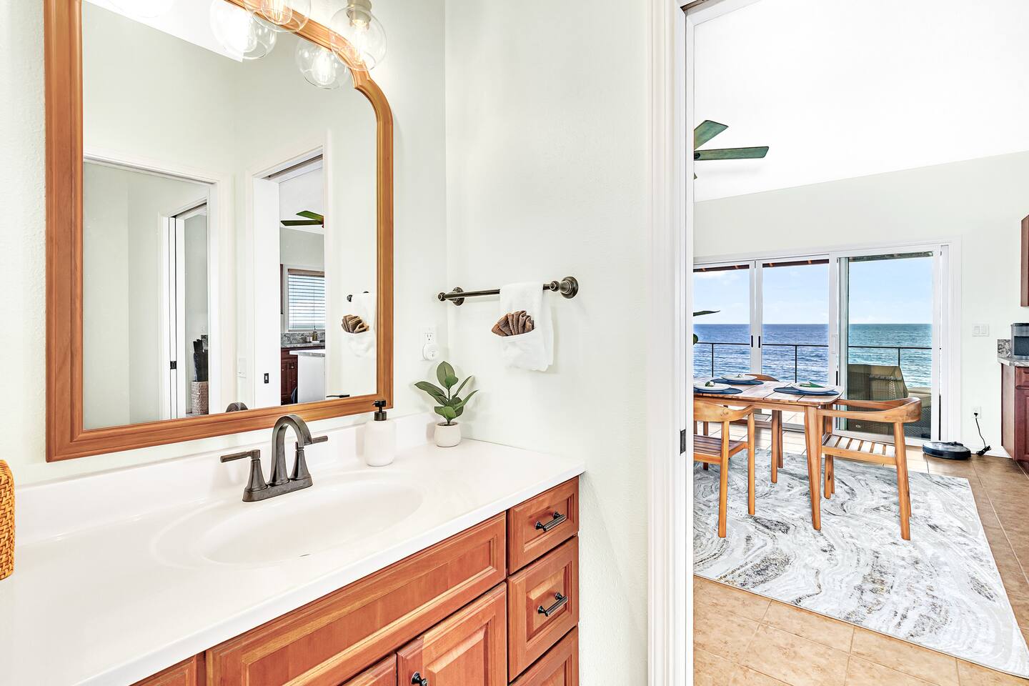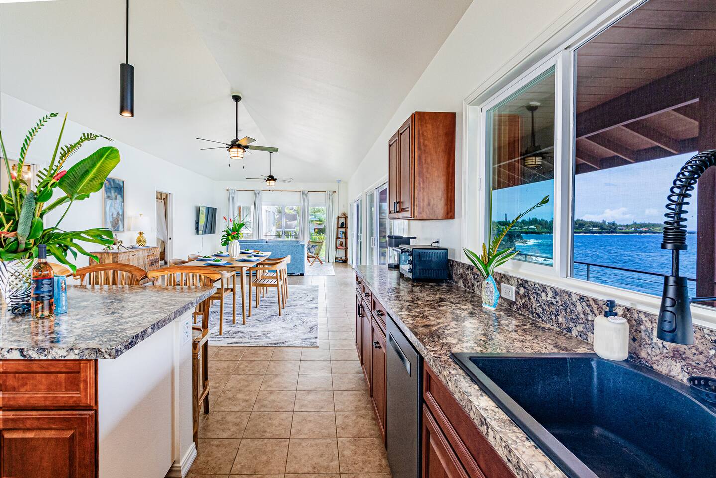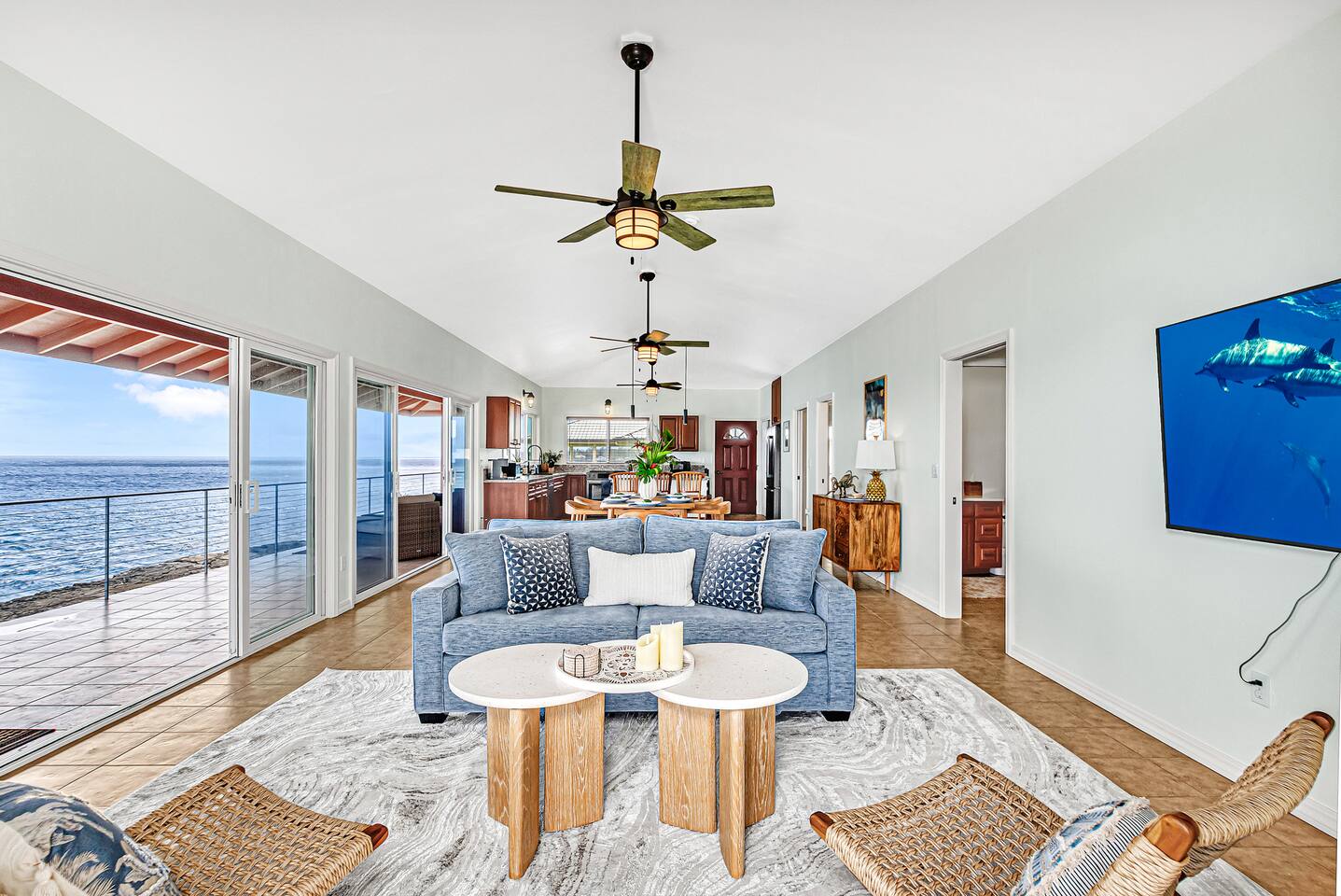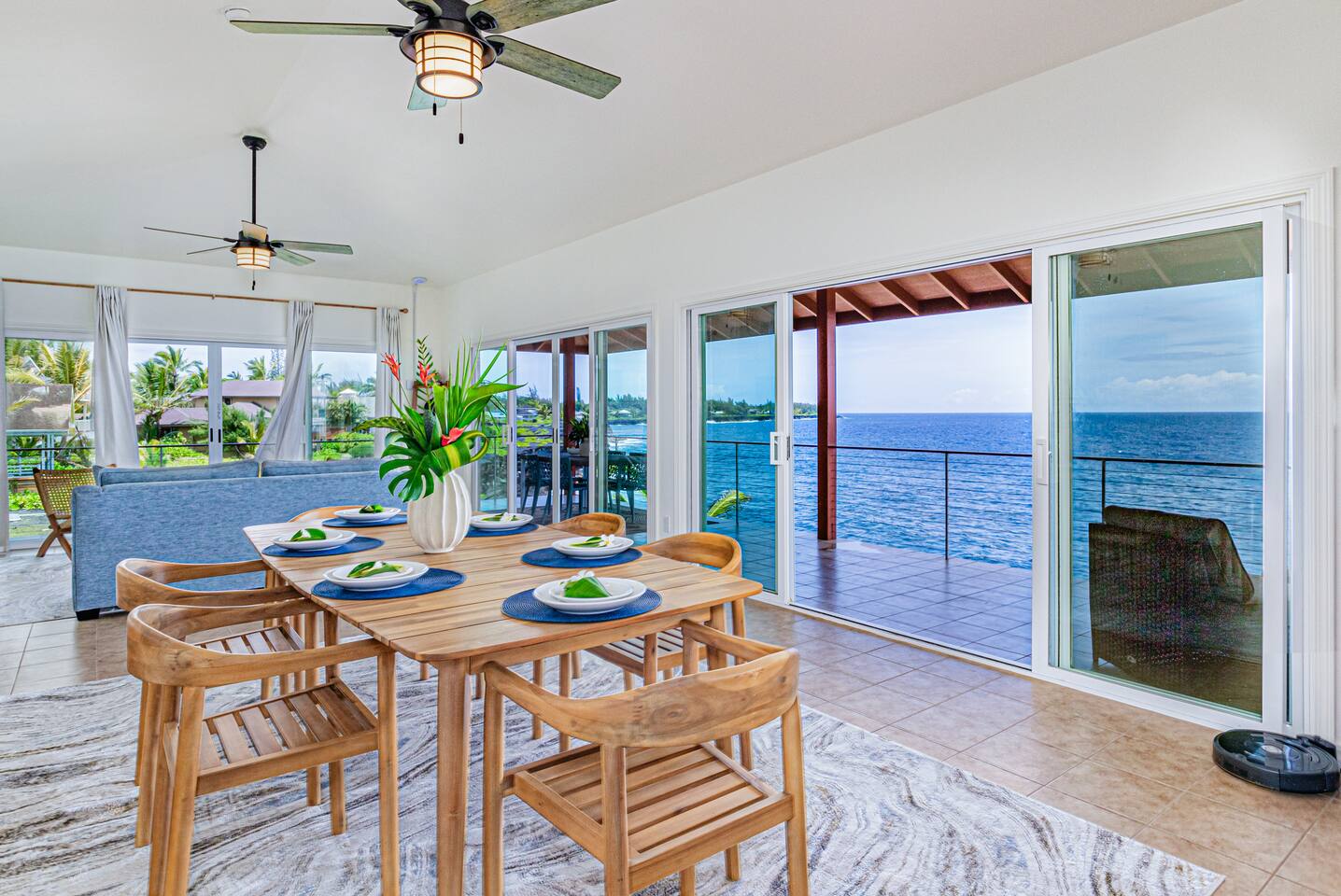 Located on Hawai'i's Big Island (the island of Hawai'i) 25 minutes south of Hilo International Airport. Paradise Ocean Vista is a stunning absolute oceanfront home that feels more like you are on a yacht than at a house. Watch and hear the waves below. Wake up to ocean views from every room! We proudly offer high-quality, comfy Leesa Queen mattresses for your comfortable nights sleep! Beautiful furnishings, designed by NestEgg Designs. The chef-inspired kitchen with new stainless steel appliances is stocked with all the cooking utensils, pots, pans and dishes needed to cook delicious seaside meals. Serve your culinary delights with a side of paradise in a dining area with panoramic ocean views and a sliding door that opens up to the lanai. For a complete oceanfront dining experience, pull up a chair on the lanai dining table or gather around the outdoor seating area. Allow the Hawaiian sea breeze to accompany your views of the beautiful lava rock cliffs and black sands of your paradise retreat. There are two comfortable and stylish bedrooms from which to choose. The first bedroom features ocean views, a queen bed, floor to celling blackout curtains, streaming TV, A/C, ceiling fan, dimmable lighting and a sliding screen door that leads out to the oceanfront lanai. The second bedroom features ocean views, a queen bed, streaming TV, ceiling fan and dimmable lighting. The living room also features a Queen sized pullout couch. Freshening up is a joy in the two well-appointed en suite bathrooms featuring a shower with handheld sprayer, soft towels, hairdryer, toiletries (shampoo, conditioner, body wash) and other thoughtful travel amenities like sunscreen and bug repellant for your waterfall hikes. Paradise Ocean Vista Amenities include: Free WiFi. Fastest WiFi available on the island (fiber), WiFi mesh system covers the entire property in case you want to work outside on the beautiful lanai, Outdoor lounge area, Air conditioner and dehumidifier, free Parking, Full-sized stainless steel refrigerator, Bosch stove w/ convection oven, cooking utensils, pots, pans, dishes, 55-inch HiDef Smart TV, Comfortable mattresses (Leesa) Washer and Dryer, dishwasher, Contactless check-in, boogie/body surfing boards, beach towels and a cooler for your beach excursions. Your host Chase holds an active Hawaii real estate license RS-88207 with Hilo Bay Realty, LLC