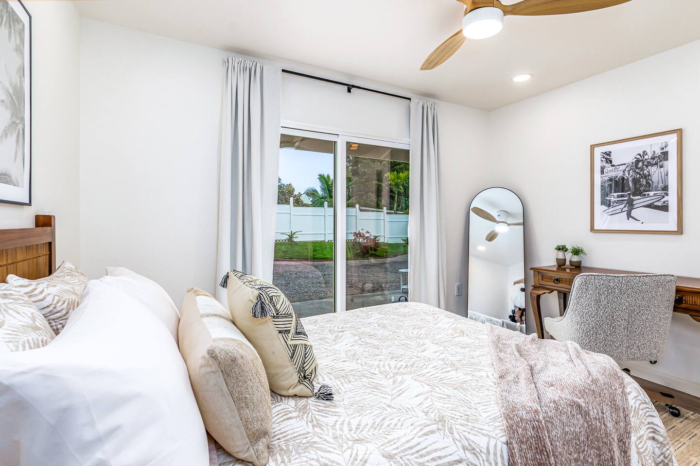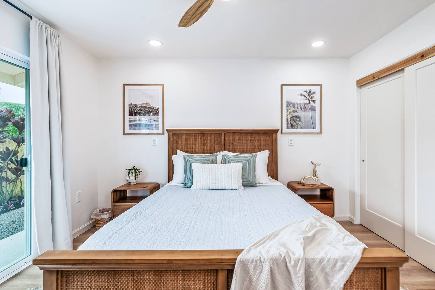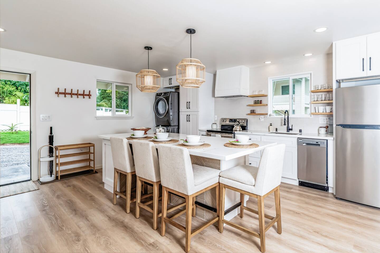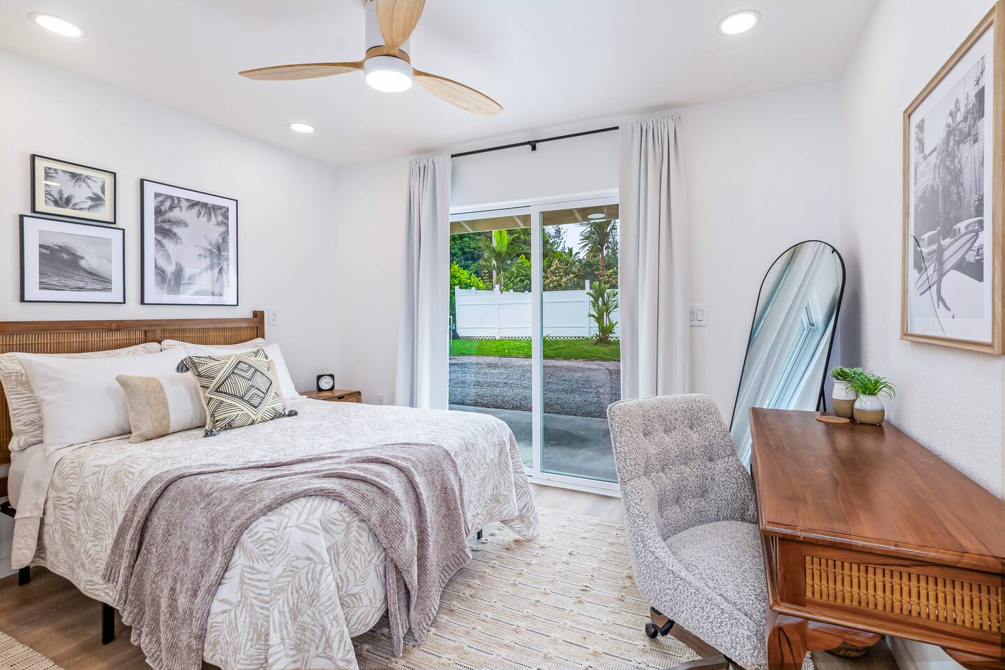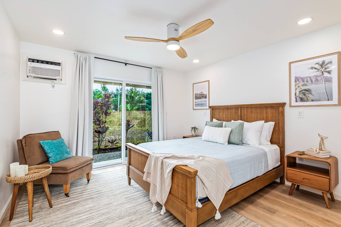 Sunrise Ohana is a cozy and luxurious 2 Bedroom 1 Bath with everything you could want located in a gorgeous and very walkable neighborhood. The chef's gourmet kitchen features an oven, stove, dishwasher, full refrigerator and freezer, a washer and dryer with detergent and stain remover and a gorgeous dine-in kitchen island for 4. The living room features a large Smart TV to stream your favorite shows and a door out to the garden and patio. The main bedroom has a Queen sized bed, fine cotton linens, dimmable reading lights, ceiling fan, AC unit with remote, side chair, full closet for storage of clothing and suitcases, full sized mirror, private entry sliding door to the tropical garden. The second bedroom has a Full sized bed, fine cotton linens, dimmable reading lights, ceiling fan, desk with chair, full closet for storage of clothing and suitcases, full sized mirror, private entry sliding door to the tropical garden. The house is fully fenced with a security gate and offers free parking for at least two vehicles.