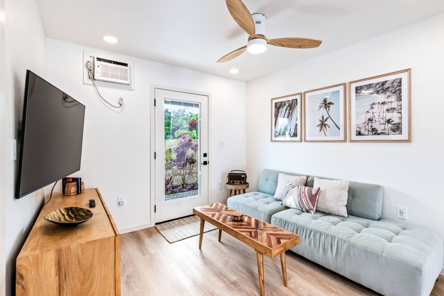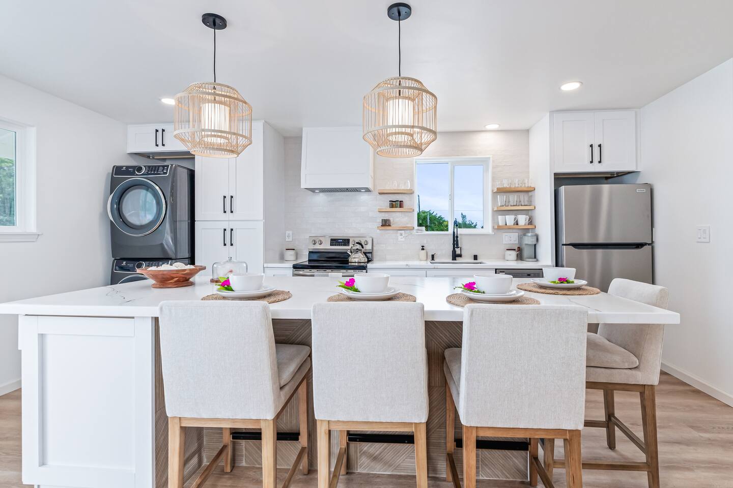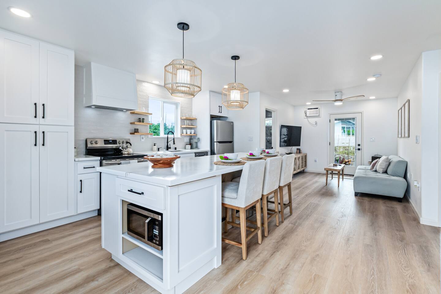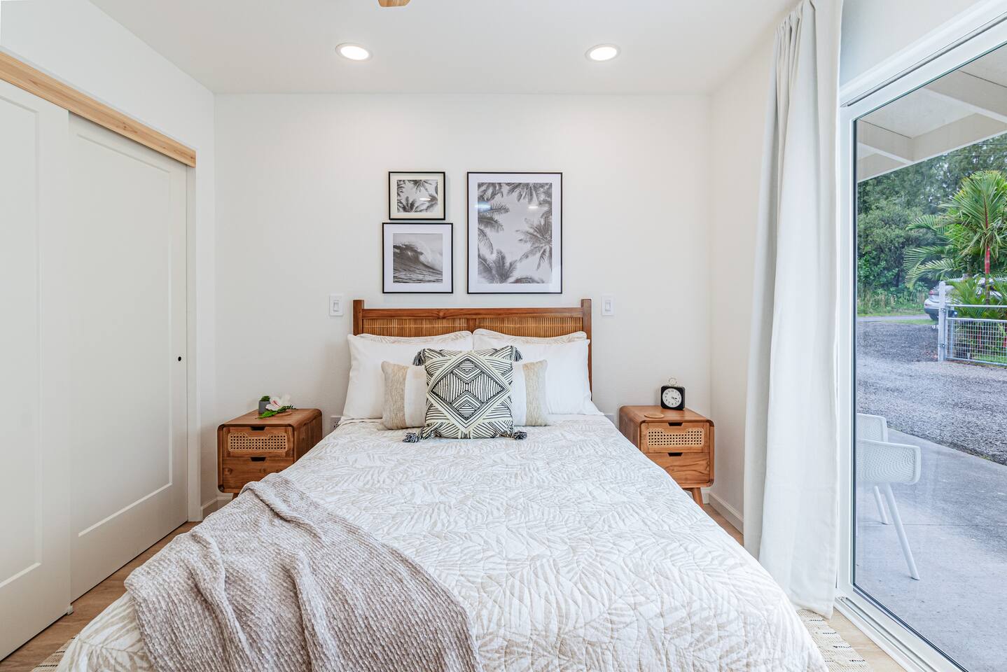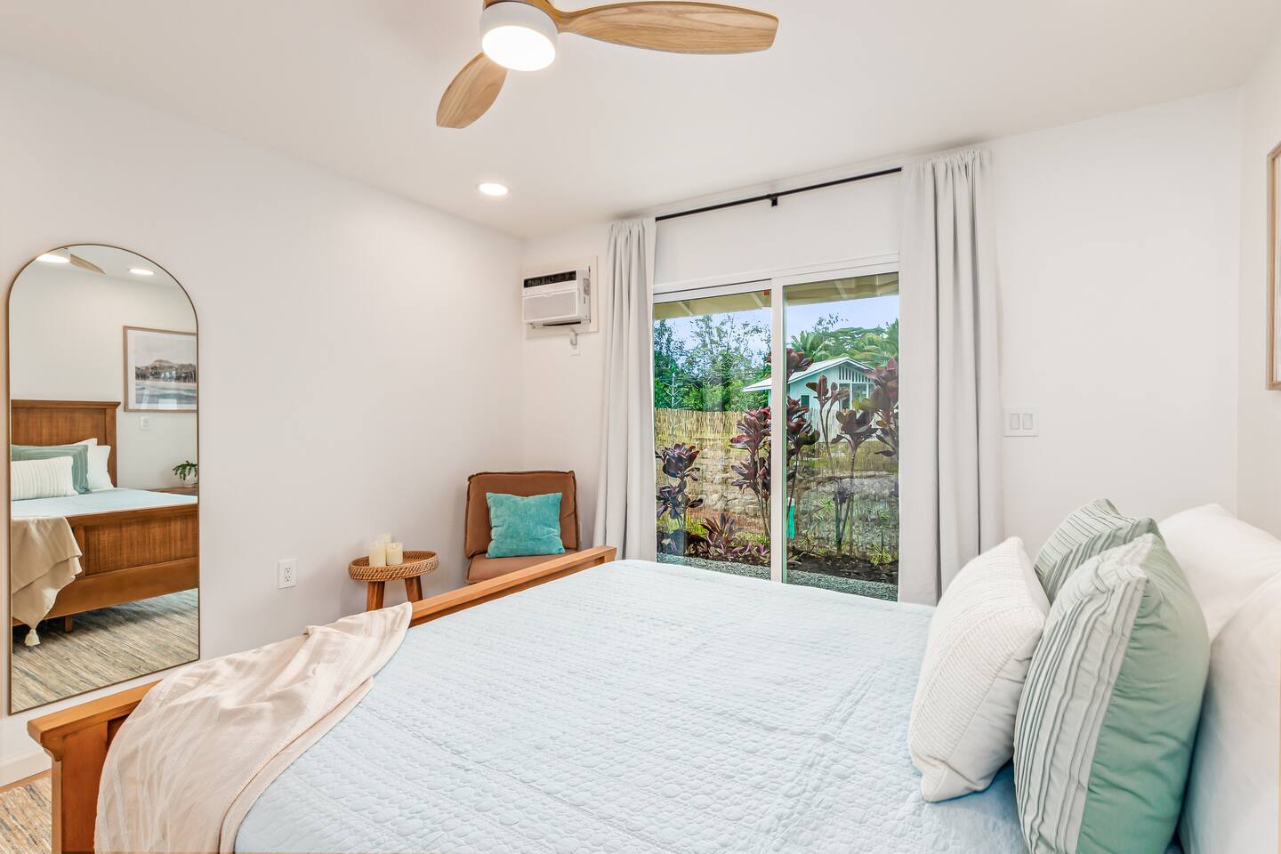 Sunrise Ohana is a cozy and luxurious 2 Bedroom 1 Bath with everything you could want located in a gorgeous and very walkable neighborhood. The chef's gourmet kitchen features an oven, stove, dishwasher, full refrigerator and freezer, a washer and dryer with detergent and stain remover and a gorgeous dine-in kitchen island for 4. The living room features a large Smart TV to stream your favorite shows and a door out to the garden and patio. The main bedroom has a Queen sized bed, fine cotton linens, dimmable reading lights, ceiling fan, AC unit with remote, side chair, full closet for storage of clothing and suitcases, full sized mirror, private entry sliding door to the tropical garden. The second bedroom has a Full sized bed, fine cotton linens, dimmable reading lights, ceiling fan, desk with chair, full closet for storage of clothing and suitcases, full sized mirror, private entry sliding door to the tropical garden. The house is fully fenced with a security gate and offers free parking for at least two vehicles.