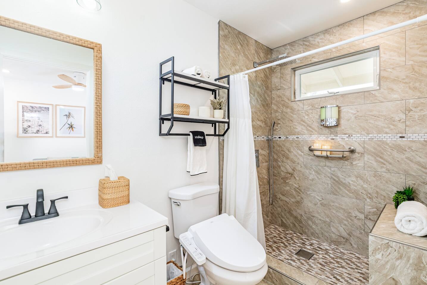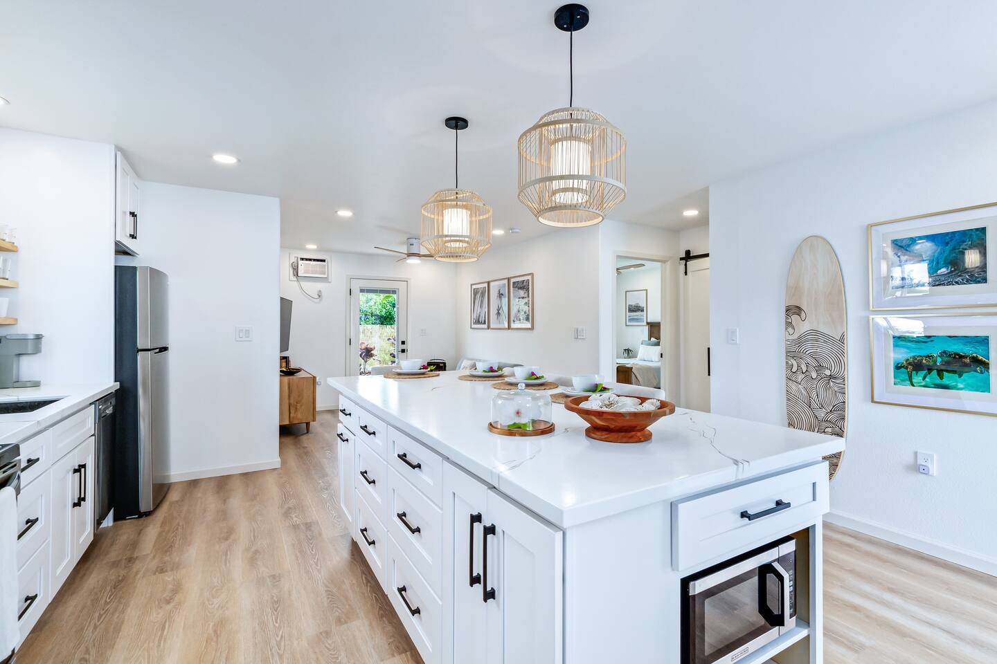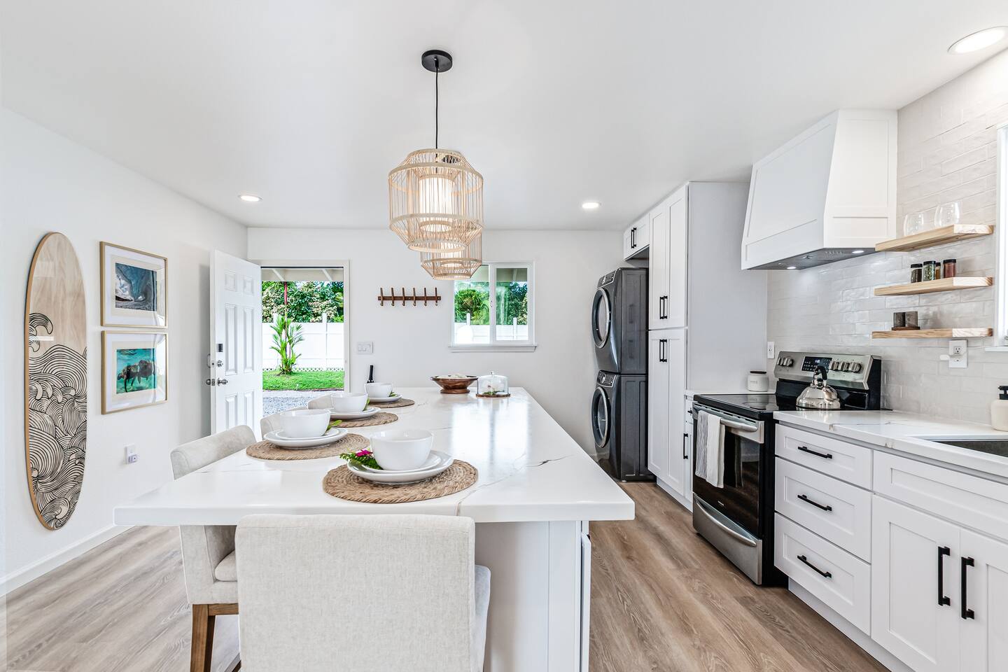 Kick back and relax in this calm, stylish space. 2 BR, 1 bath home one block from the ocean! This unit has all of the modern luxuries one could want. Designed by a top interior designer. Enjoy the oversized dine-in kitchen island, washer and dryer in unit, A/C, heated bidet, spa-like bathroom. Each bedroom has it's own private entrance and light and bright slider door out to a large patio. Fully-fenced and professionally landscaped yard one block from the ocean and the gorgeous Maku'u Point!